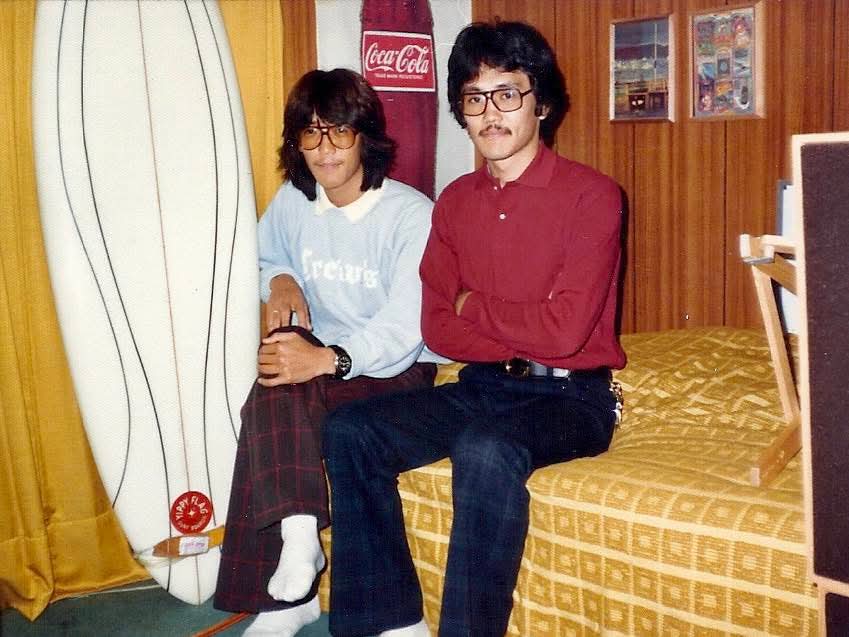 写真提供:鷹取義人さん(左)1979年 サックスブルーの〈クルーズ〉のトレーナーで、ボトムスは〈リーバイス〉のニットパンツ。右に写るお兄様の〈ファーラー〉ホップサックパンツと〈グッチ〉のベルトも良い感じ。