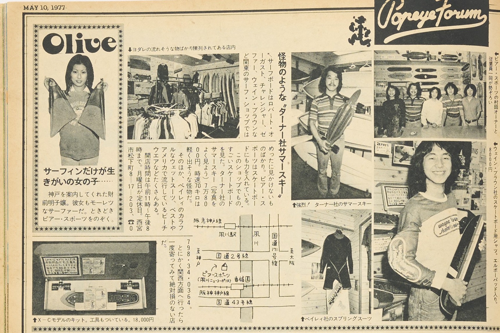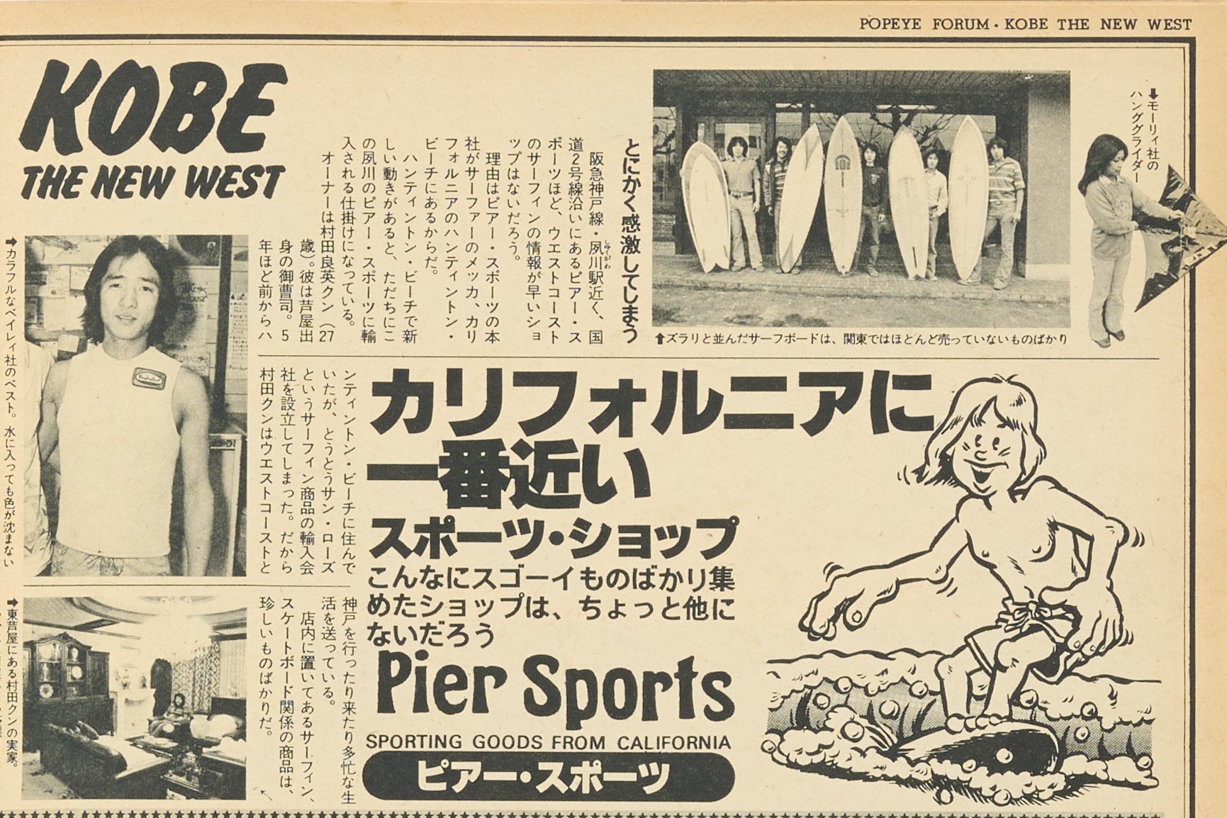 その店の名前は、兵庫県西宮市にあった〈ピアスポーツ〉。高感度なカリフォルニアのサーフ&スケートアイテムがずらりとラインナップされていて、ここで扱うブランドのものを着ていれば、関西圏ではこの店に出入りしているイケてるやつだと一目で理解してもらえるほどだった。その証拠に『POPEYE』6号で紹介されており、「関東のサーフショップではめったに見かけないものばかり」と記されている。