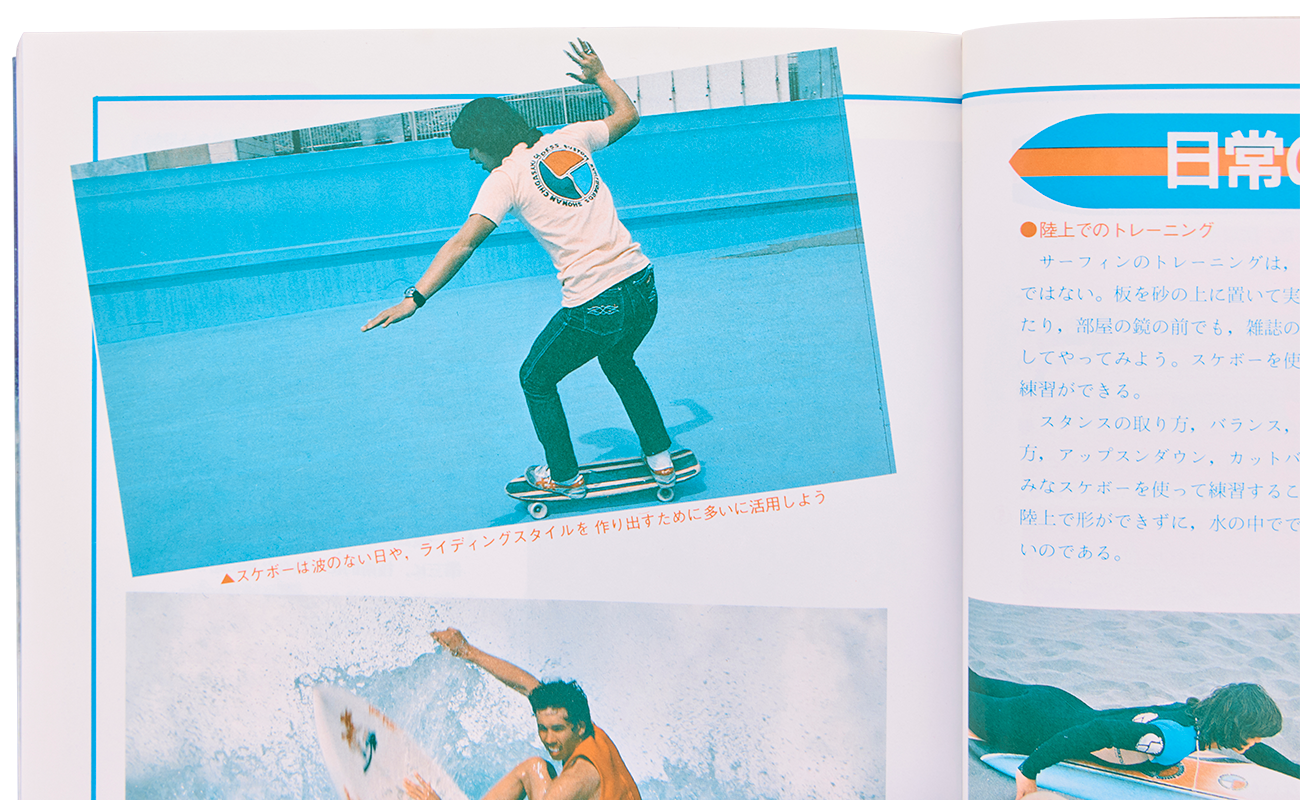 1981年「講談社スポーツシリーズ サーフィン」。〈ゴッデス〉Tシャツに〈サスーン〉のジーンズを合わせるスケーター。トップ画像で〈ゴッデス〉ショップ前に佇む筆者は、足先までほぼこの写真のまんま。足元が〈アシックスタイガー〉なのも良き。