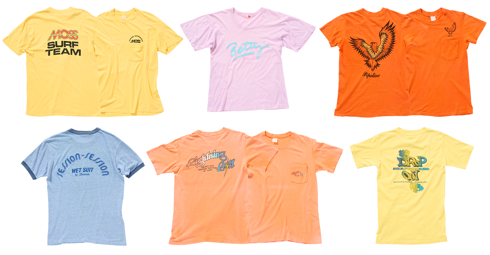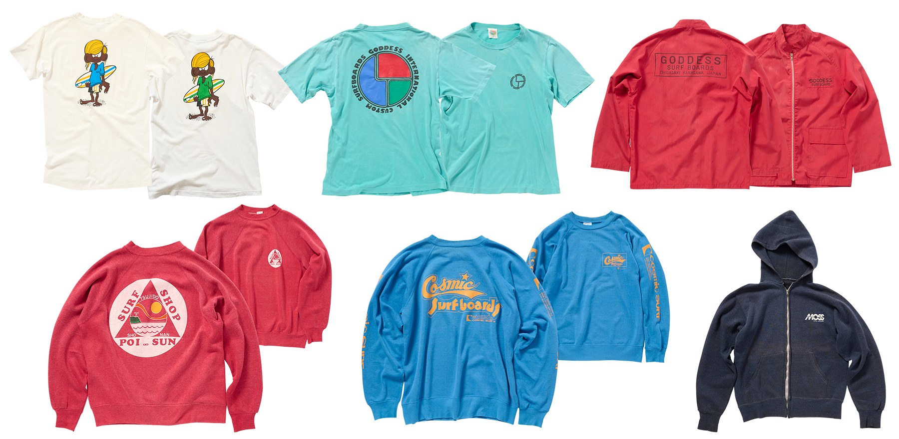 サーフボードメーカー&ショップが急増した70年代後半。80年代初頭にはその数は低く見積もっても倍以上になり、湘南は本場アメリカ西海岸に負けず劣らずのサーフタウンイメージを確立した。誌面に記載されていた“サーフボード以外のオリジナル”というのが具体的にどんなものだったのかというと、やはりロゴもののプリントTシャツ一本かぶりで、冬はトレーナー(スウェット)が主軸となる。茅ヶ崎〈ゴッデス〉に、辻堂〈パイプライン〉、鵠沼の〈モス〉に、鎌倉の〈ドロップアウト〉などなど、多くのサーフショップが作り、売りに売った。