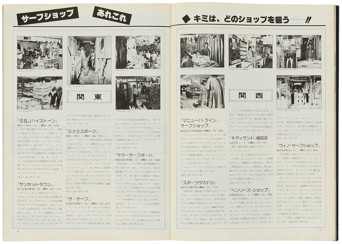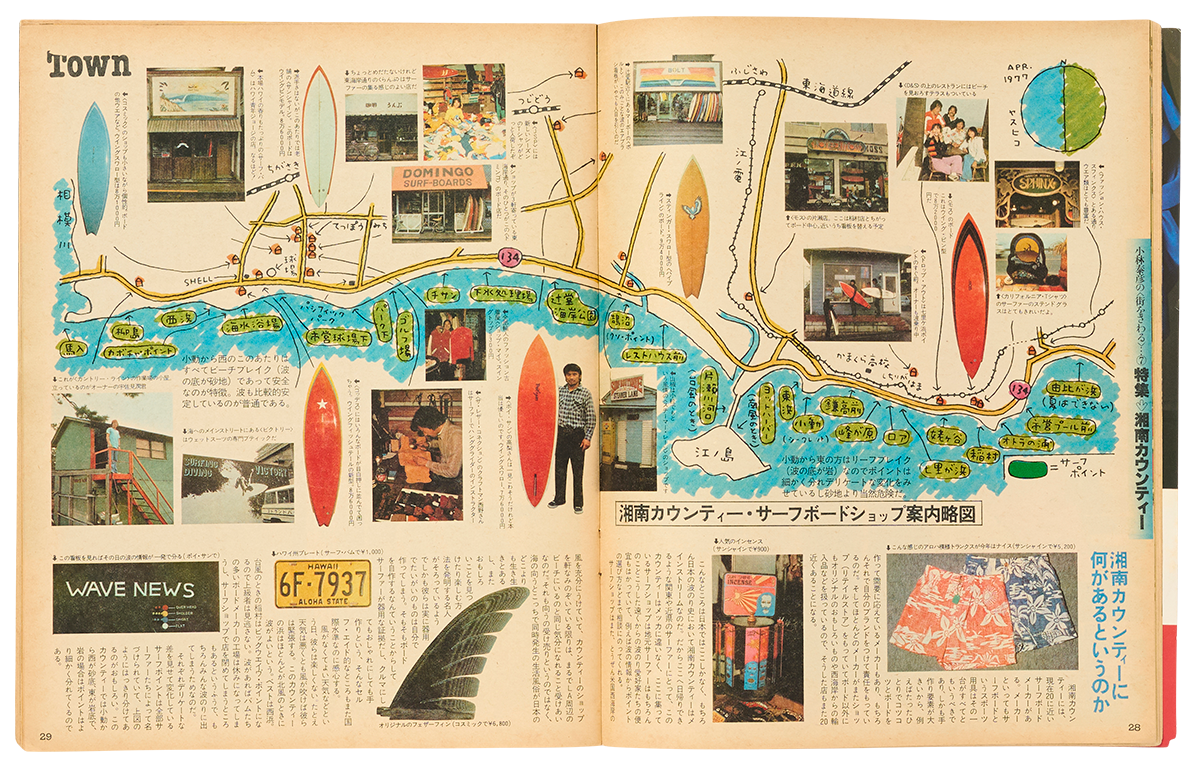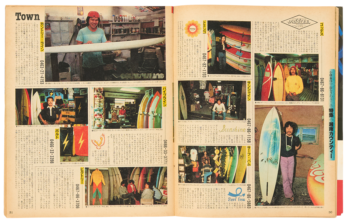 「湘南カウンティーには、現在20に近いサーフボードメーカーがある。そしてそのほとんどのメーカーがショップ(リテイルストア)をもっていて、ボード以外にもオリジナルのおもしろいものや西海岸からの輸入品などを扱っているので、そうした店もまた20近くあることになる――」