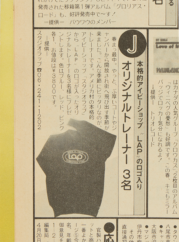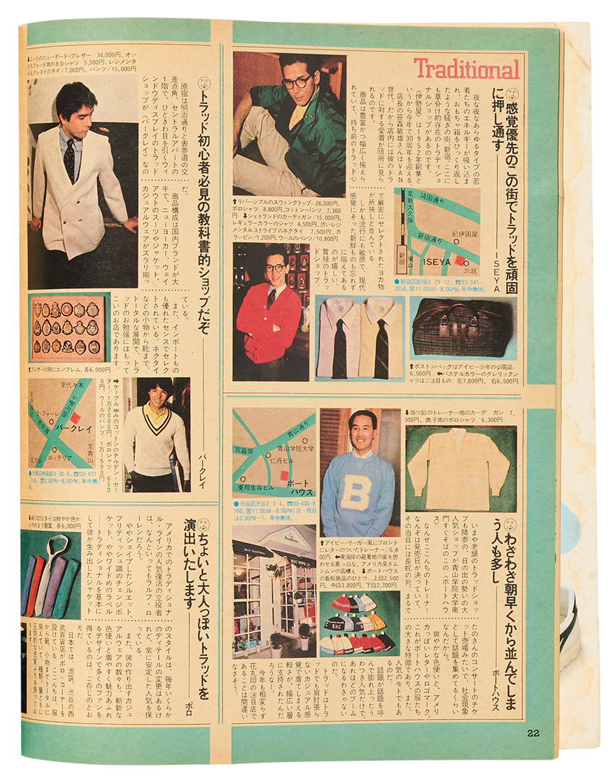 神戸では〈MAC〉というショップも大好評。ここは日本最古のメンズファッションブランド〈VAN〉と提携していただけに、多くの学生が集まったと聞く。78年の〈VAN〉倒産以降も、オリジナルブランドや〈ラルフローレン〉〈Jプレス〉などを扱うセレクトショップとしてアイビー派に支持された。あとは大阪・アメリカ村に〈スタジオラップ〉という店があったという情報も当時の大阪発のタウン誌『BOOP』で得た。きっと他の街にも、ニュートラ派に愛用されていたブティックがまだまだあったのだと思う。