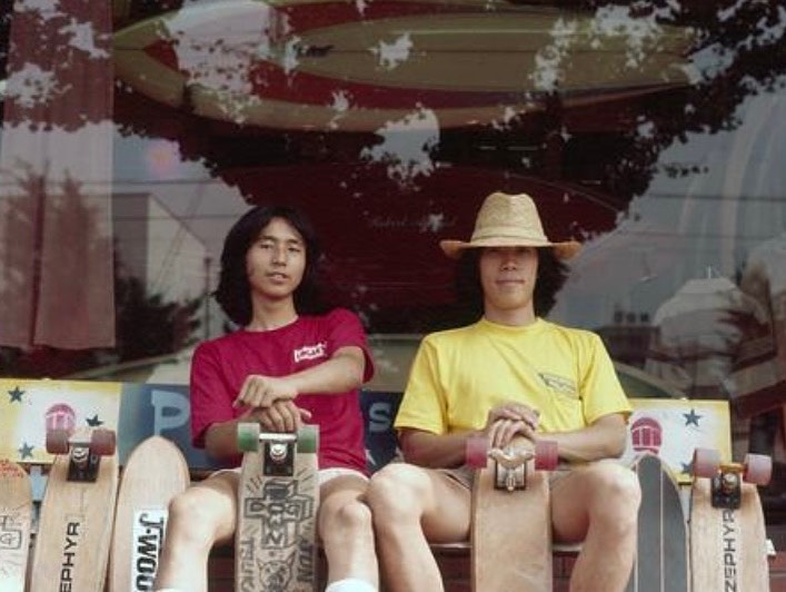 写真提供:Chu Katsumoto 1977年の神戸〈ピアスポーツ〉前にて。 スケートボードメーカー〈ローガンアーススキー〉のTシャツを着る塚本さん(左)と、スケートトラックメーカー〈トラッカー〉のTシャツを着るヒロさん(右)が超クール。