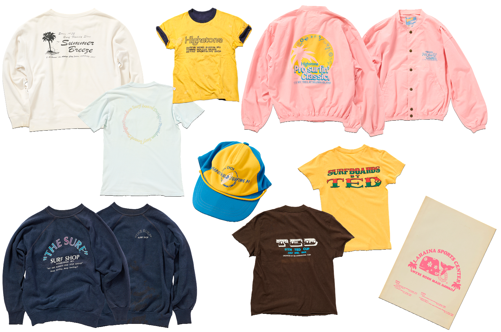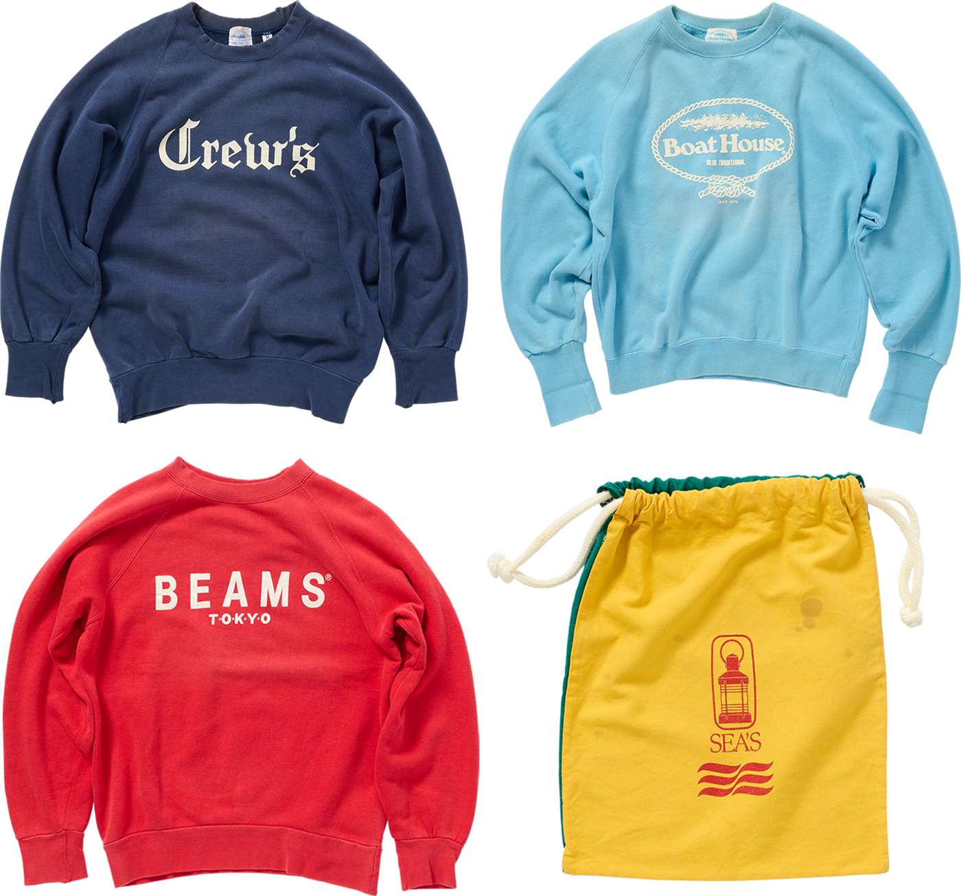 原宿〈クルーズ〉、〈シーズ〉、〈ビームス〉、〈バークレイ〉、青山〈ボートハウス〉。ワスレチック時代はサーフショップのみならず、アメリカンテイストのブランド兼ブティックがどんどん増えていった頃でもある。〈ハリウッドランチマーケット〉に〈ミウラ&サンズ〉、〈るーふ〉といった、忘れてはいけない名店が他にもたくさんあるが、前述の店は特にトラッド系として人気を博した。アイテムはシャツやブレザーなど色々あったけど、中でもショップロゴ入りのオリジナルトレーナー(スウェット)が大流行。ぶっちゃけ79~81年頃はロゴものだけで店の売上が成り立つくらい売れに売れたのではないだろうか。