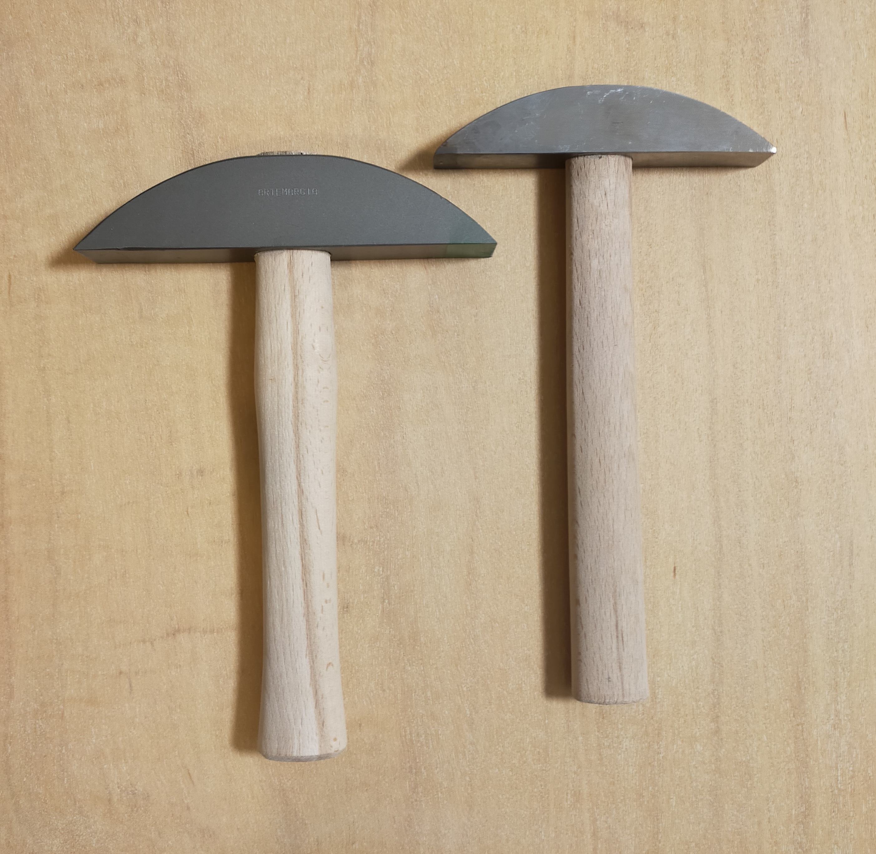 そのため、まずは石を割る作業から始まります。使うのはモザイク用の半月型ハンマーと刃を垂直に固定した石割り台。石割り台の刃とハンマーの刃を水平に合わせて、こう!
