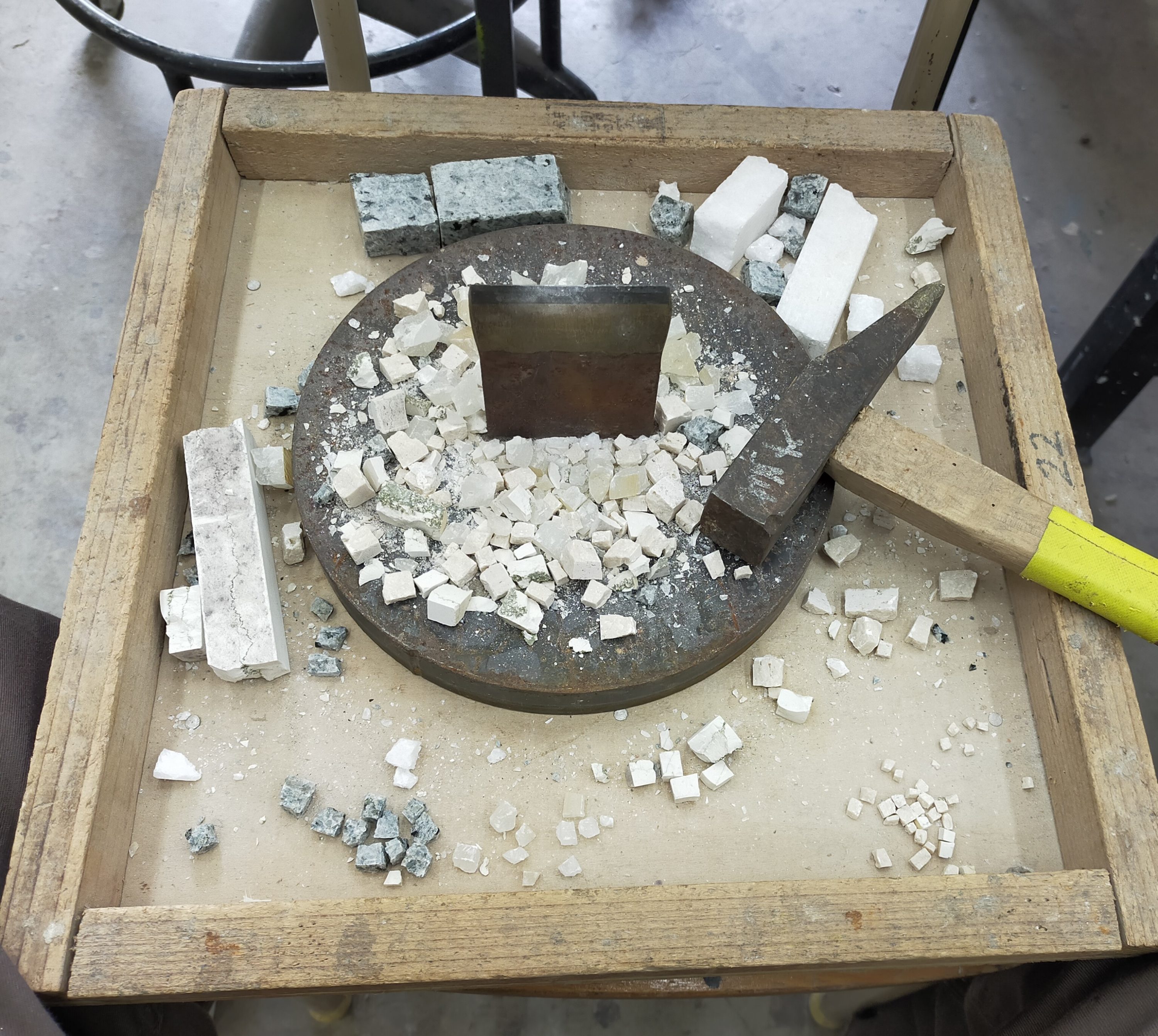 御影石や蛇紋石(じゃもんせき)は硬くて力がいりますが、大理石はけっこう簡単に割れます。ズマルト(モザイク用ガラス)は力を入れすぎると粉々になってしまうので注意が必要です。