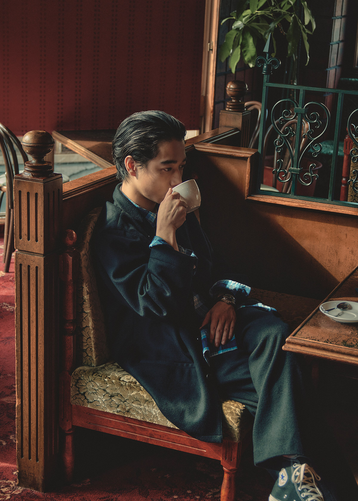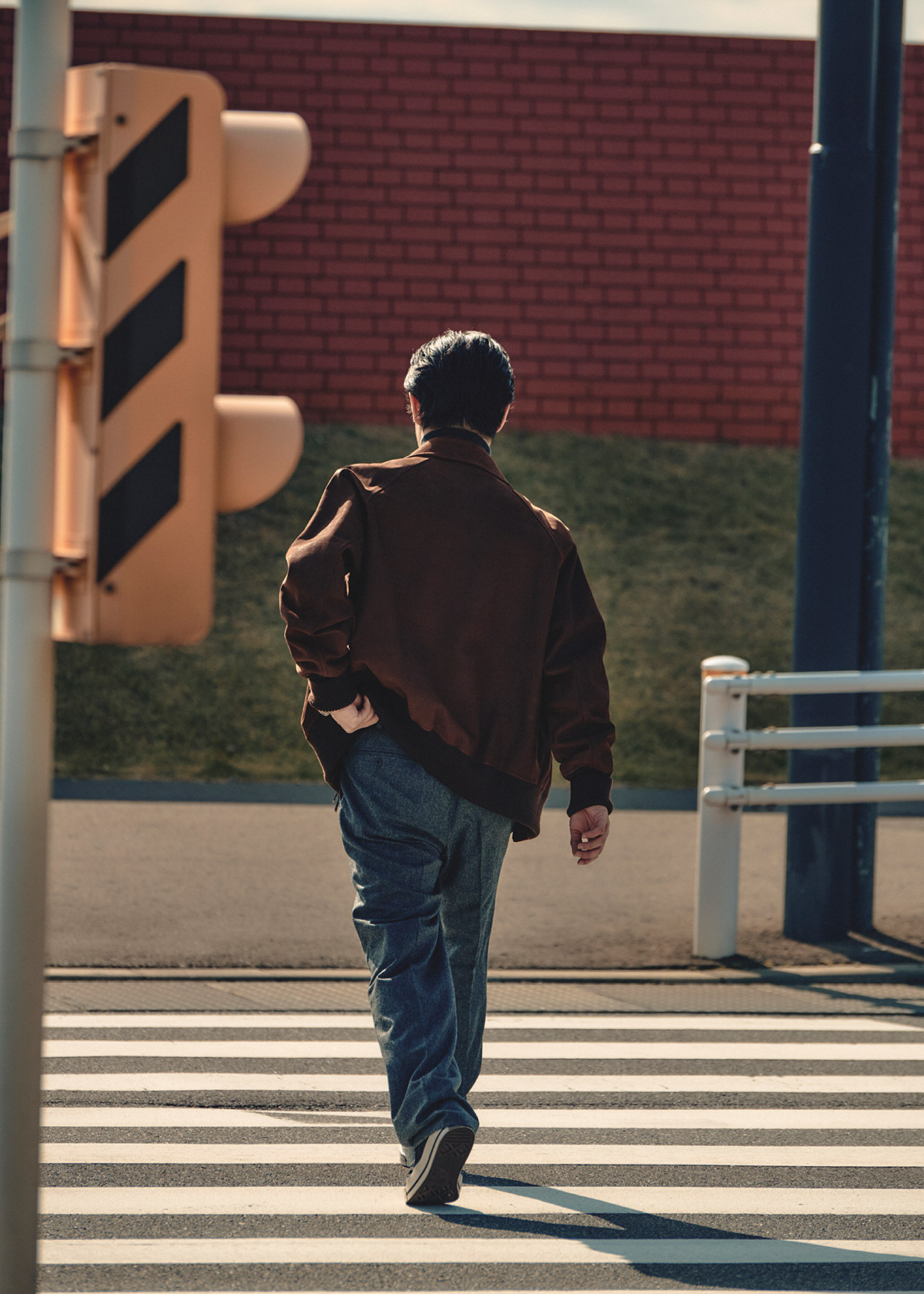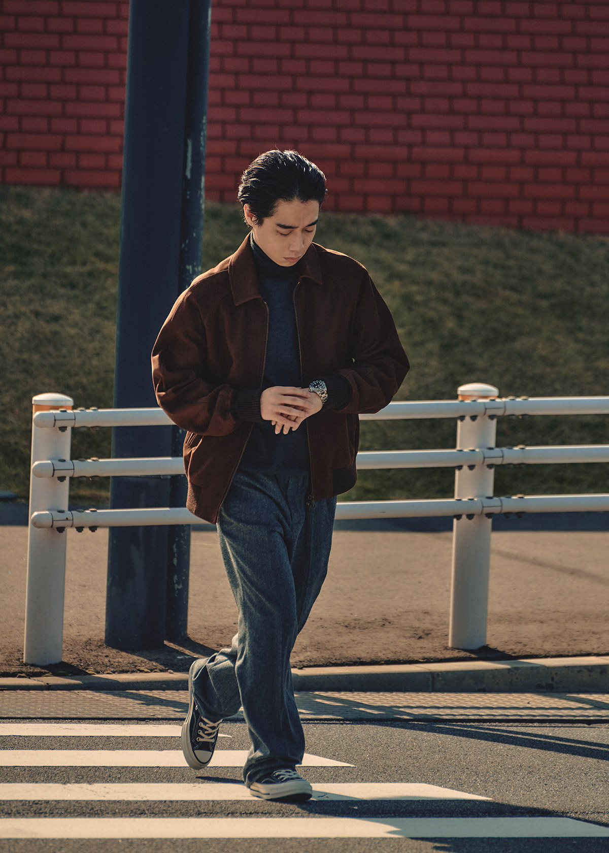 ヌバックレザーブルゾン¥385,000 カシミヤタートルネックセーター¥62,700 ウールフラノパンツ¥59,400(すべてメゾン エ ヴォヤージュ/メゾン エ ヴォヤージュ 麻布台ヒルズ店☎03・5797・8515) スニーカー「オールスター LGCY HI」¥13,200(コンバース/コンバースインフォメーションセンター☎0120・819・217)