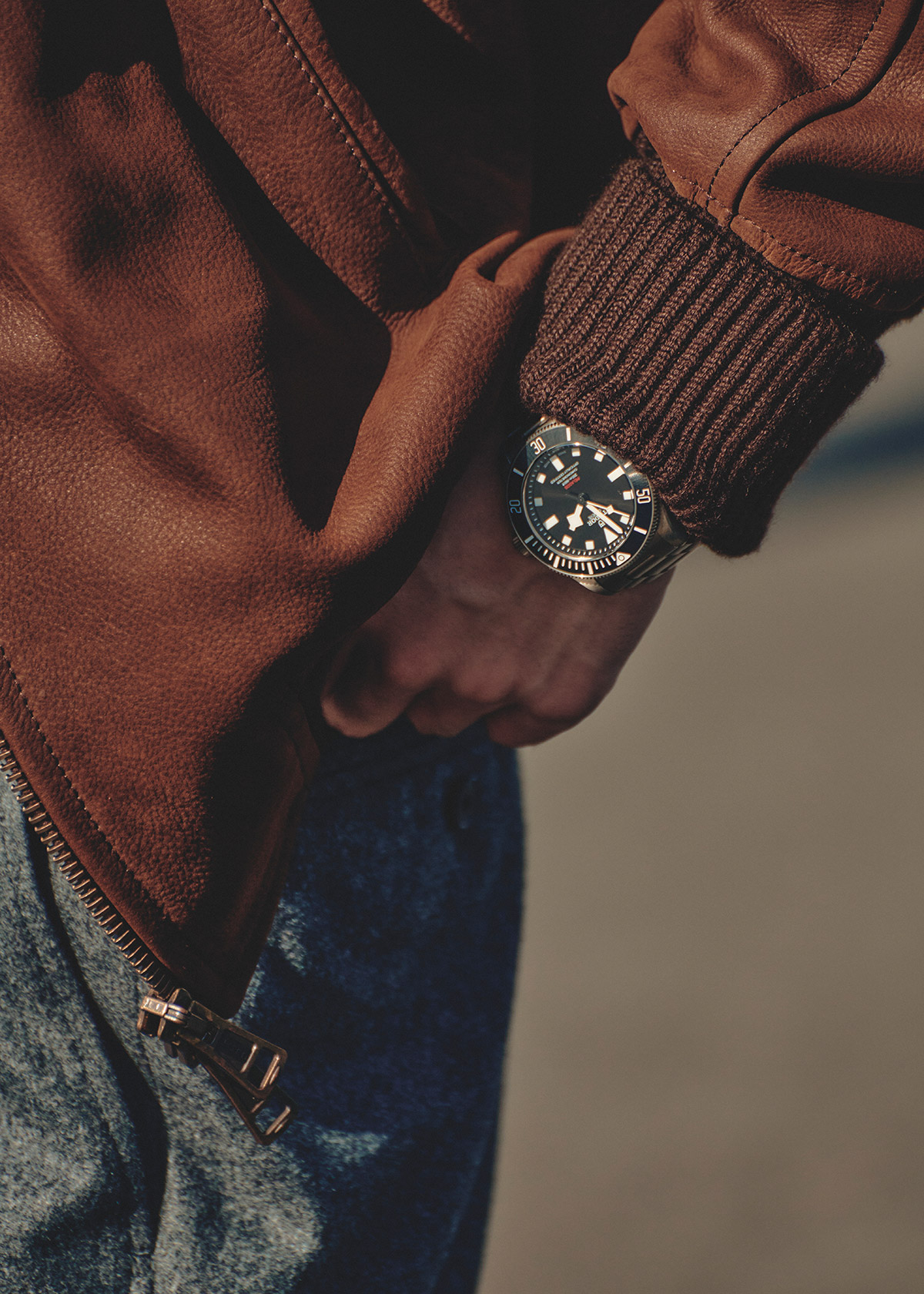 ’50年代のクラシカルなフォルムを残した「ブラックベイ 58」。深いブルーがシックな装いともマッチし、ケース径39㎜のサイズ感が日本人の腕にすんなりと馴染む。約70時間のパワーリザーブ機能に200m防水と、海でも街でも気兼ねなく使えるタフさを備える。自動巻き、ステンレススティール製。 ¥563,200(チューダー/日本ロレックス / チューダー☎0120・929・570)
