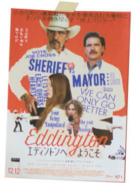 『ミッドサマー』のアリ・アスター監督最新作。舞台はコロナ禍のニューメキシコ州の小さな町エディントンで、マスク着用の小競り合いで始まった市長選。カルト教祖や陰謀論、SNS炎上も絡んでいく、カオス全開のアリ・アスター・ワールドに付いていけるか。