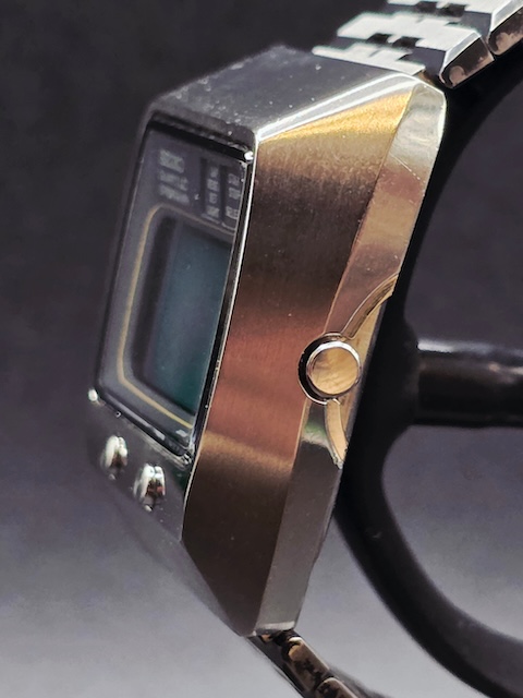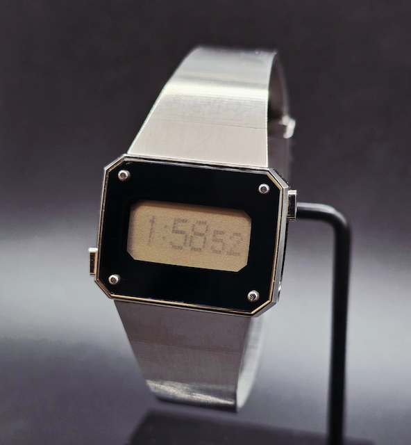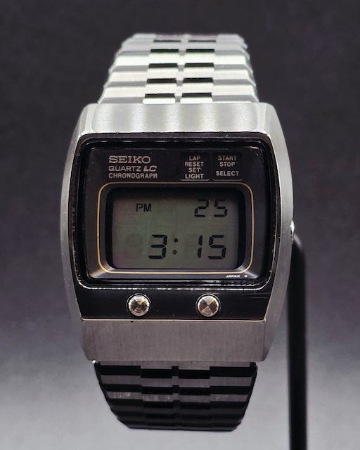 理由は世界初の量産デジタルクロノグラフ(ストップウォッチ)モデルなんです。外装デザインは「70sスペースエイジ」ケースで金属塊の質感が重厚。フロントボタンもヴィンテージ感満載です。