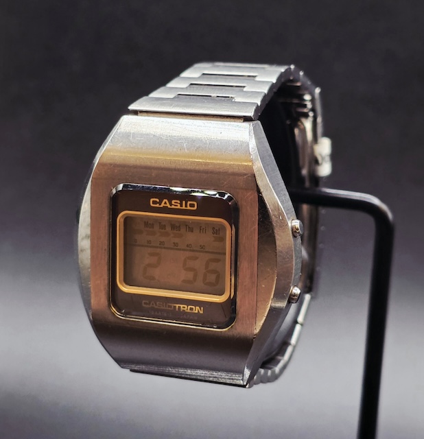 角張ったステンレスケースとゴールドのインナーベゼルが象徴的。曜日表示を備えた液晶画面は実用性と先進性を両立し、のちの「G-SHOCK」へ続く 〈CASIO〉デジタル哲学の出発点となりました。電子時計黎明期の工業デザインを色濃く残す、歴史的価値の高い1本です。