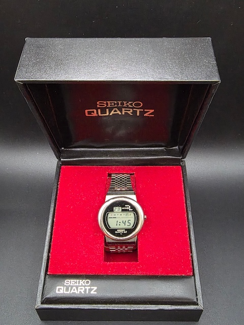 続きましては「QUARTZ LC(Liquid Crystal)」。こちらもメーカーは〈SEIKO〉。威風堂々な化粧箱を見ると、当時いかに高級だったかがうかがえます。