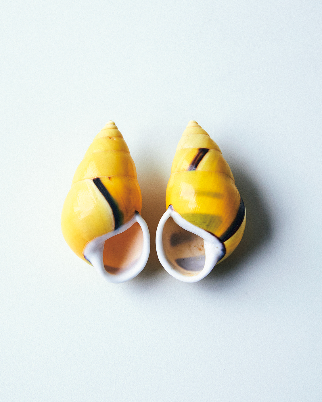 インドネシア、カンゲアン諸島の固有の、マレーマイマイの一種(Amphidromus perversus butoti f. infraviridis)。下部が緑色になり、黒褐色のタスキ模様が入る。貝殻の標本を扱うお店やミネラルショーなどで手に入れることができる。