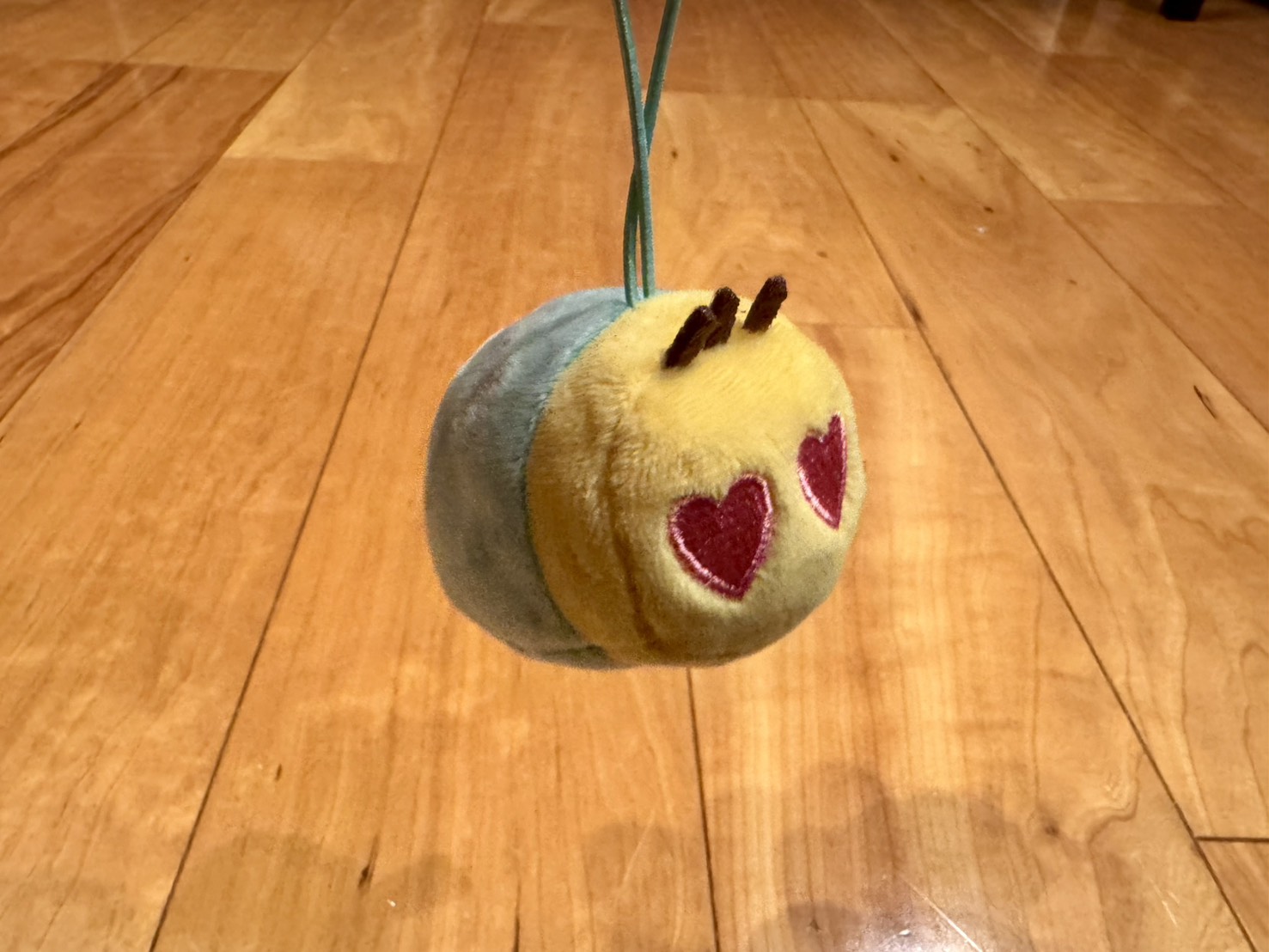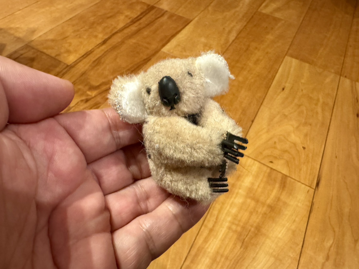娘がまだ小さかった頃にお婆ちゃんが気分次第で買ってくれたもので、クリップとしてもマスコットとしても中途半端な代物だったのですが、これがコロッケにとっては激ハマり。適度な重さの獲物感と、爪の部分のプラスチック部品が床を擦る効果音が狩猟感を増幅させるようで、彼の大のお気に入りです。ワゴンの上に置いてあったりすると、自らヒョイとワゴンに飛び乗り「さあコアラ狩りの時間です!」と咥えて持ってきたりすることもあります。