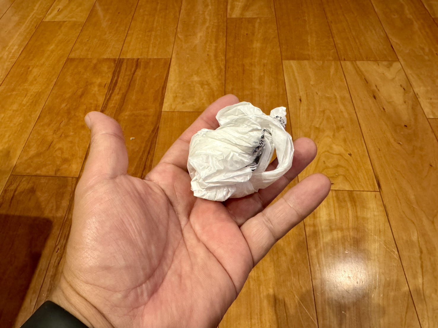 なんでもないコンビニのビニール袋を縛って丸めてボール状にしたものです。コロッケはこのビニール袋のシャリシャリ音がたまらないらしく、こちらがそういうつもりでもなくコンビニの袋を結んでいたりすると「アレでしょ?アレなんでしょ⁉」と、ワクワクした眼で近寄ってきて、投げてもらうのを心待ちにします。重さがほぼ無いに等しいので、ドリブルのワンアクションに対する動きの反応が大きく、ダイナミックなステップでダイニングテーブルの下を駆け抜けるプレーを見せてくれます。そして何よりコスト的に最高。