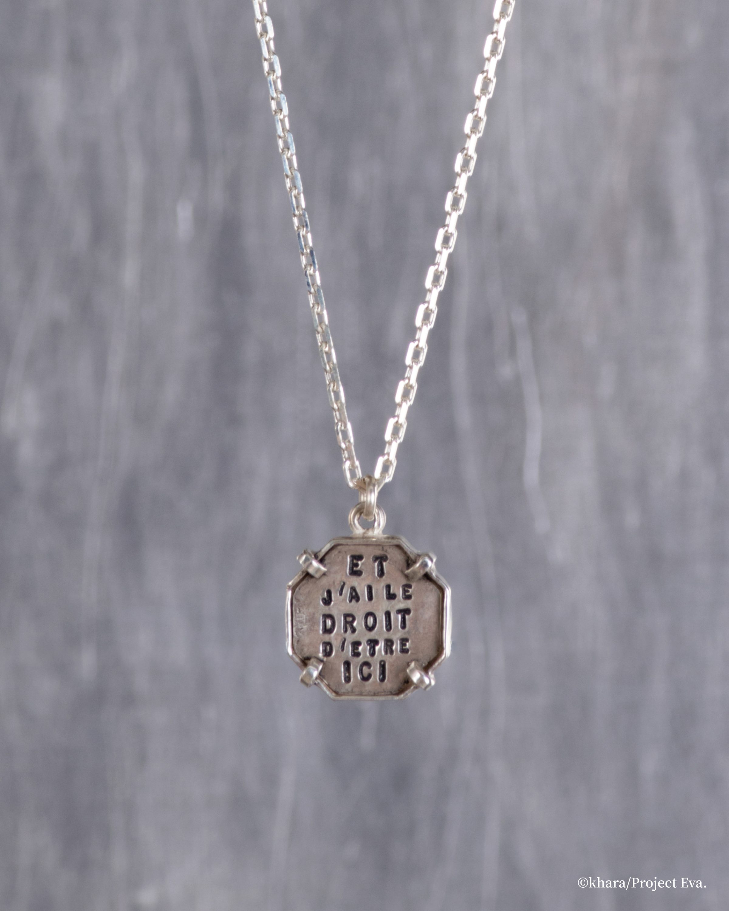 幾何学的な八角形は作中で重要な役割を果たす「A.T.フィールド」から着想を得たモチーフ。そこに、碇シンジのセリフ「僕はここにいてもいいんだ!」、綾波レイによる「私は私」、惣流・アスカ・ラングレーの「私を見て」。これらの言葉が刻まれ、まるで光輪のように身につけた人を守り、包み込んでくれる。