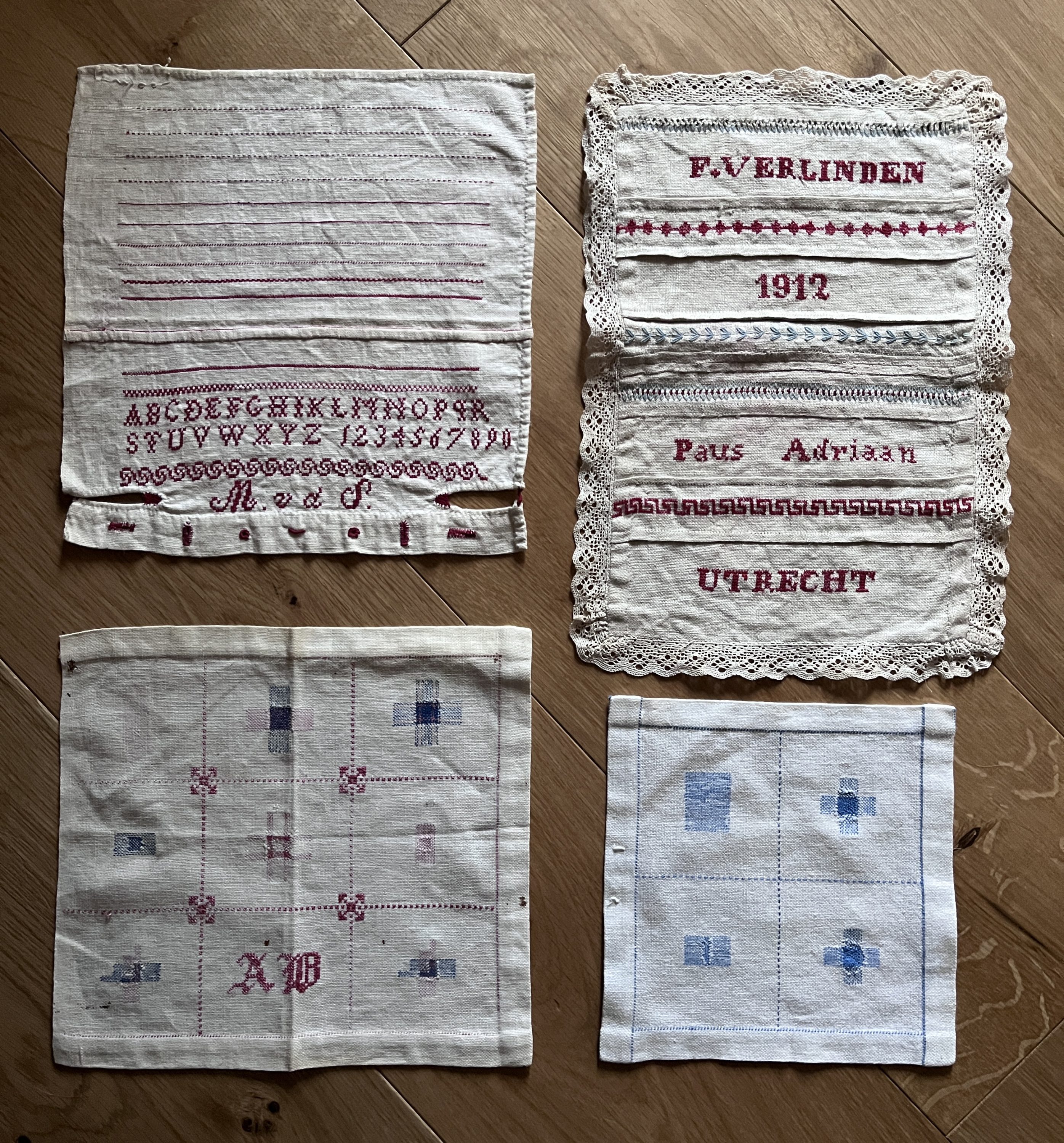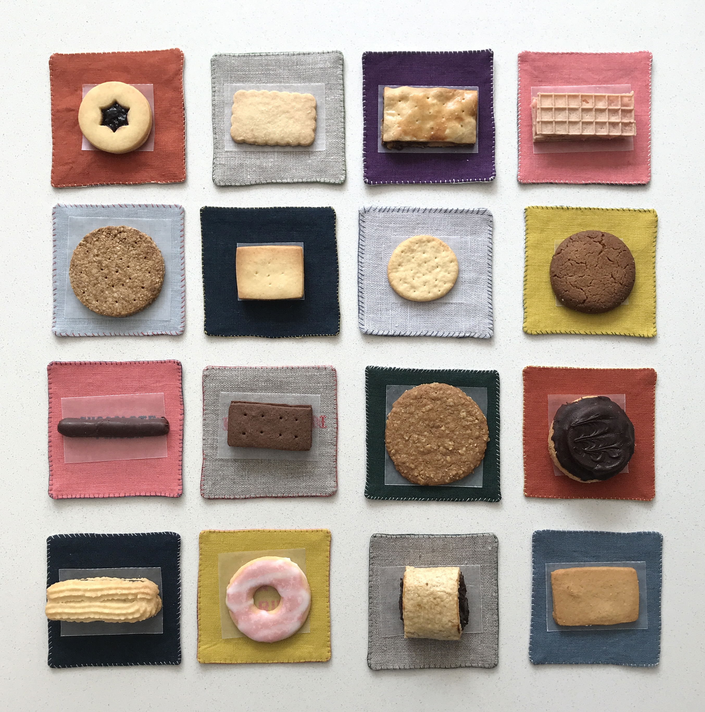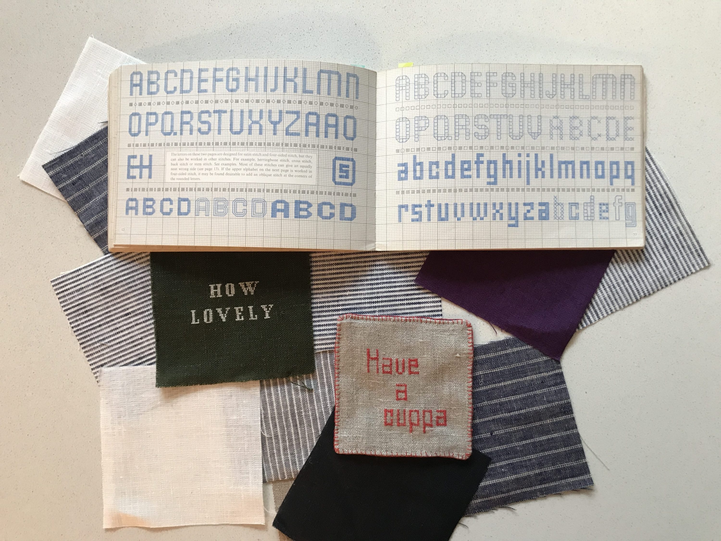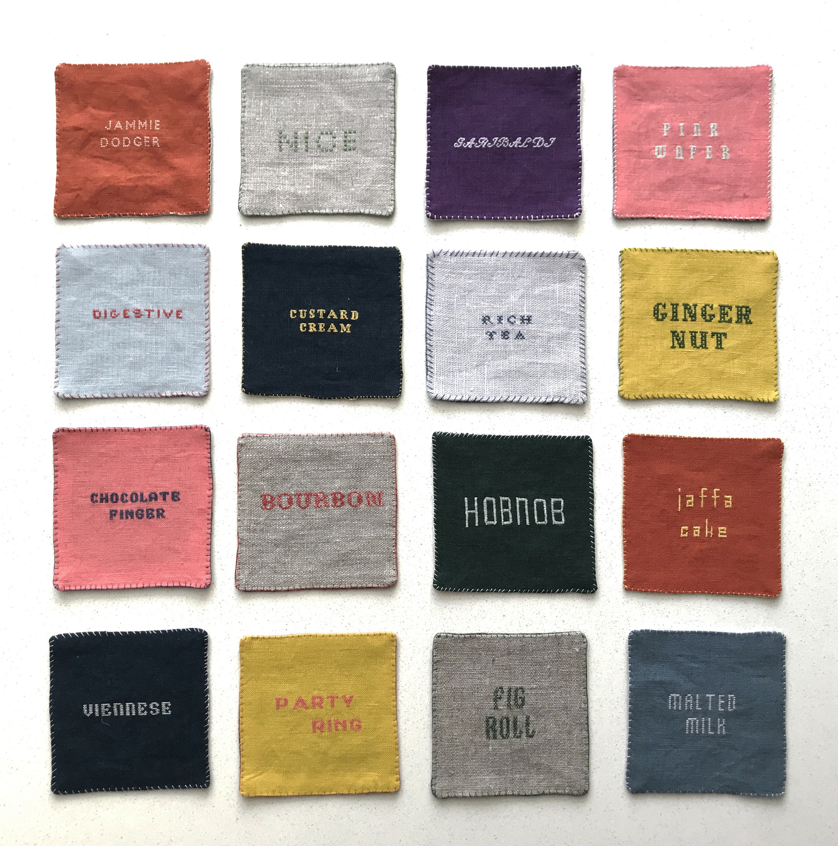 そんな折、ある展示で、17世紀ヨーロッパで少女たちが刺繍や繕いを練習・記録するために布に刺した「サンプラー(見本帖)」に出会い、すっかり心をつかまれました。本人たちは、まさかこれが博物館に並ぶとは思っていなかったでしょう。その地道な布片に触発され、私も母が昔使っていた刺繍糸とリネンを引っ張り出し、針を手に取ってみました。はぎれだったので、作れるのはコースターくらい。まだ英国にいた頃のことなので、もちろんティータイム用です。イギリスのおばさんやおじさんが口にしそうな紅茶まわりの言葉や、お茶のお供のビスケットの銘柄を、古本屋で買った図案集を参考にステッチしていきました。