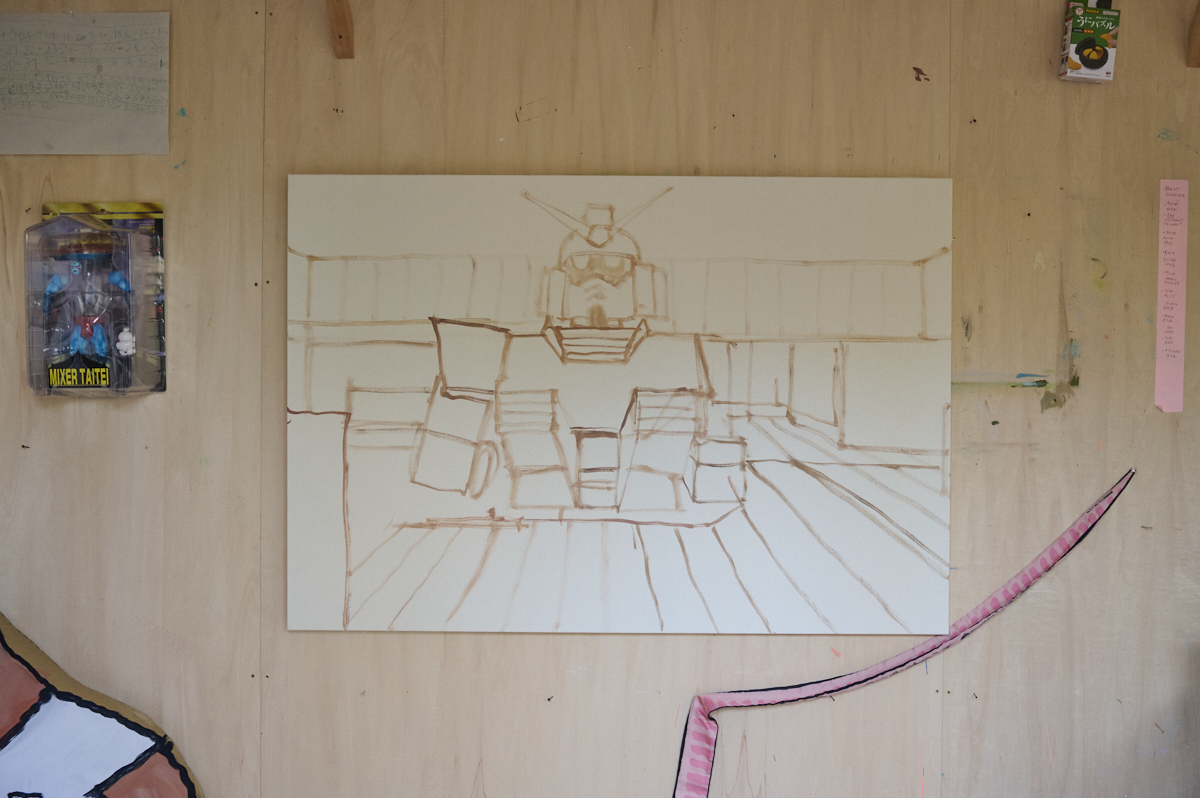お部屋には数々のアイテムのほかにガンダムの絵も。