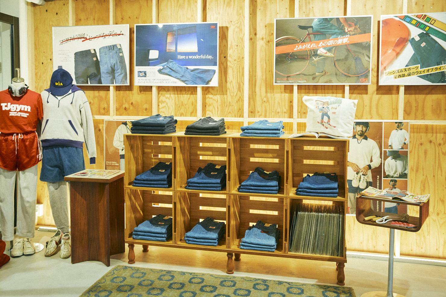 デニムブランド〈KURO〉がディレクションするフラッグシップストアで、POPEYE Webのライター、トロピカル松村さんのブランド〈CRT〉のアイテムも並ぶ。〈CRT〉エリアは’70年代のポパイ、UCLAのレコード、縄跳びなど、トロ松さんがコツコツ集めてきた私物も飾られており、そちらも見所。