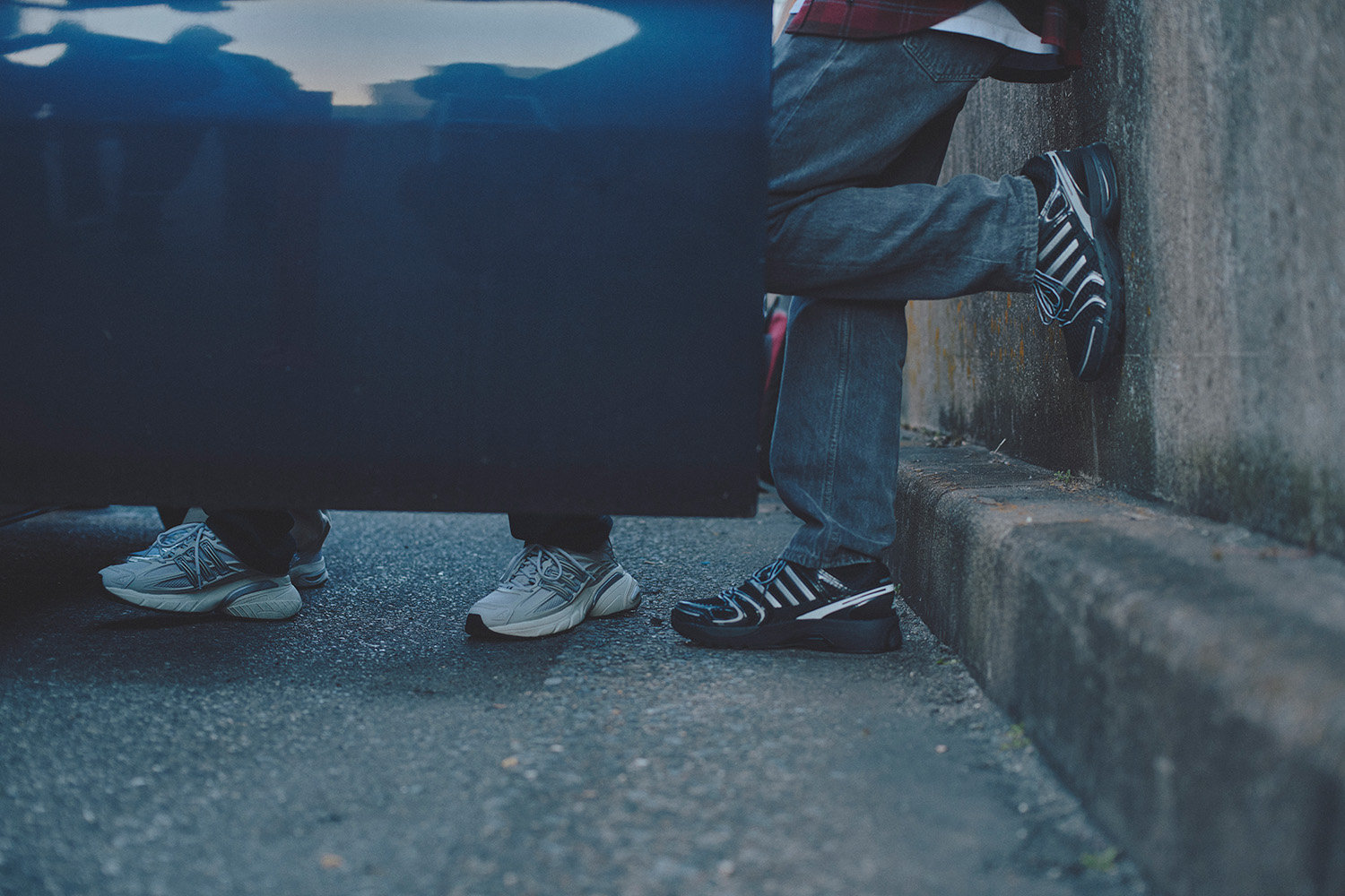左から、Daidoさん/スニーカー「アディスターXLG2.0」¥19,800、ファイヤーバードトラックトップ¥13,200(ともにadidas Originals/アディダスお客様窓口☎︎0570・033・033) Yutaさん/スニーカー「アディスターコントロール5」¥15,400、デニムファイヤーバードトラックトップ¥17,600、ハイソックス¥3,850(すべてadidas Originals/アディダスお客様窓口) Soさん/スニーカー「アディスターコントロール5」¥15,400、デニムファイヤーバードトラックトップ¥17,600(ともにadidas Originals/アディダスお客様窓口)