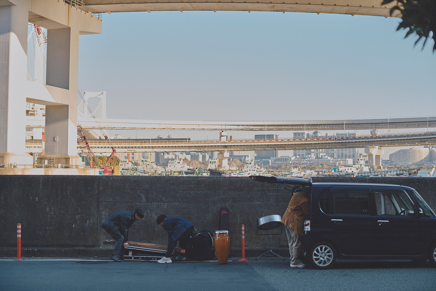 ちなみにチョ・コ・パ・コ・チョ・コ・キン・キンとは、キューバ発祥の樽型楽器、コンガの基本的なリズムパターン。名が体を表していて、チョコパは世界各地の民族音楽や楽器を電子音楽と掛け合わせたユニークなサウンドを特徴としている。今回のロケ地、芝浦ふ頭の路上で撮影した「ガンダーラ」のMVを観れば、彼らの作る音楽が手に取るようにわかるはずだ。