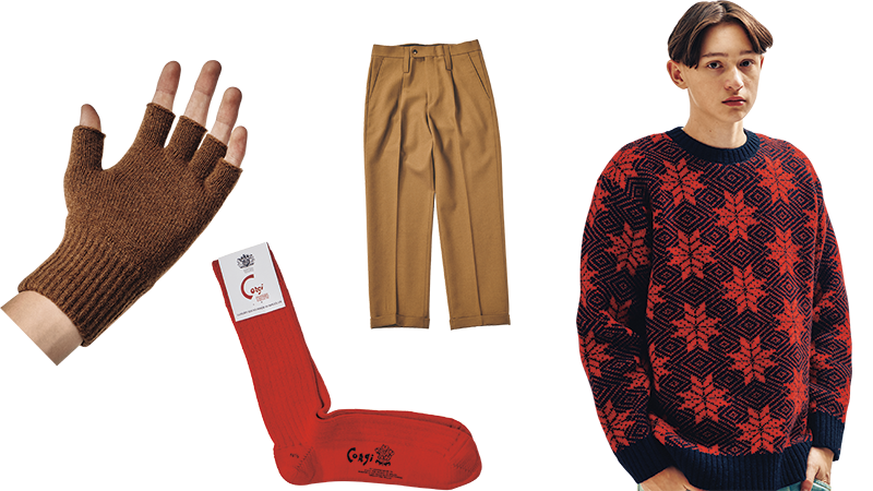 1960年代、米国の心理学者、アーネスト・ディヒター博士は、「メンズも孔雀のように様々な色彩を取り入れ、美しく着飾りましょう」(ピーコック革命)と唱えた。こうしてメンズファッションのカラフル化は急速に進んでいくわけだが、もしや“2割増し”を考える上でもグッドアドバイスかも。ネイビーやチャコールグレーを制服みたいに着ていても、あえてちょっと違う色や柄を取り入れると、気分も盛り上がってくる。差し色はクリスマスも近いし、やっぱりレッドで。『ホーム・アローン』のマコーレー・カルキンみたいに、ひとつのアイテムをこの色に染めると、なんだか元気で楽しげ(たとえアローンでもサ)。あるいは品の良さ(大事!)を重視するならキャメルがいい。映画『ある愛の詩』は、’70年代にキャメルコートブームを巻き起こしたメロドラマの金字塔。冬のボストンの景色に浮かび上がるふたつのキャメル色は、なるほどとっても上品だ。つまりガールフレンドとお揃いでもきっと素敵。いつもとはちょっと違う、スペシャルな色や柄をしのばせるチャンスはいろいろあるね。