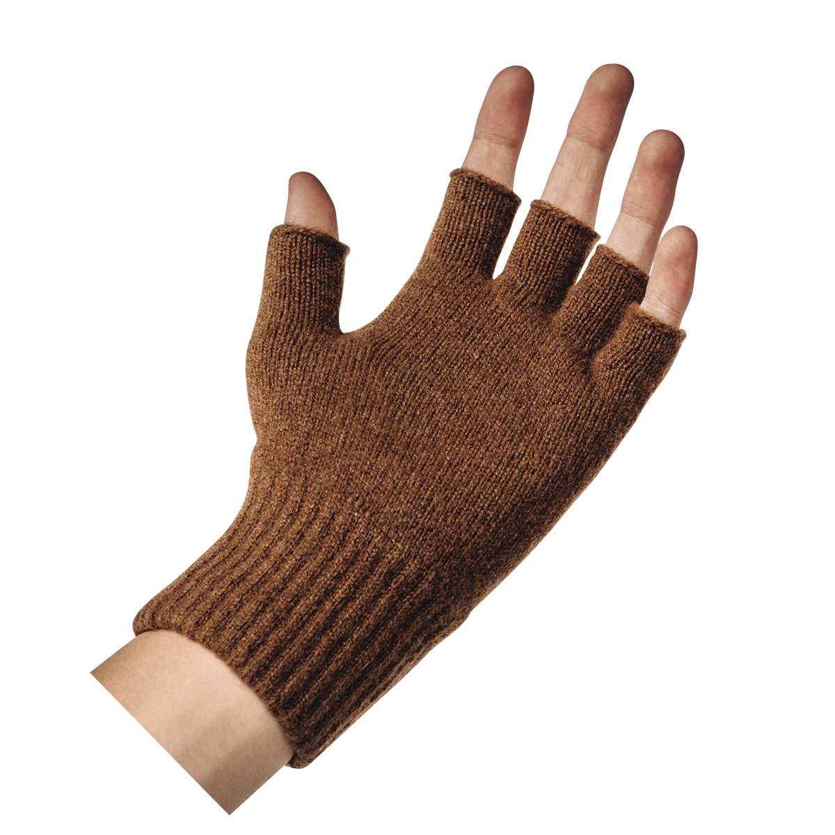 ラムズウールで編み込んだカットオフグローブ。スマホの操作も問題なし。¥11,000(エムエイチエル.☎03·5785·6445)