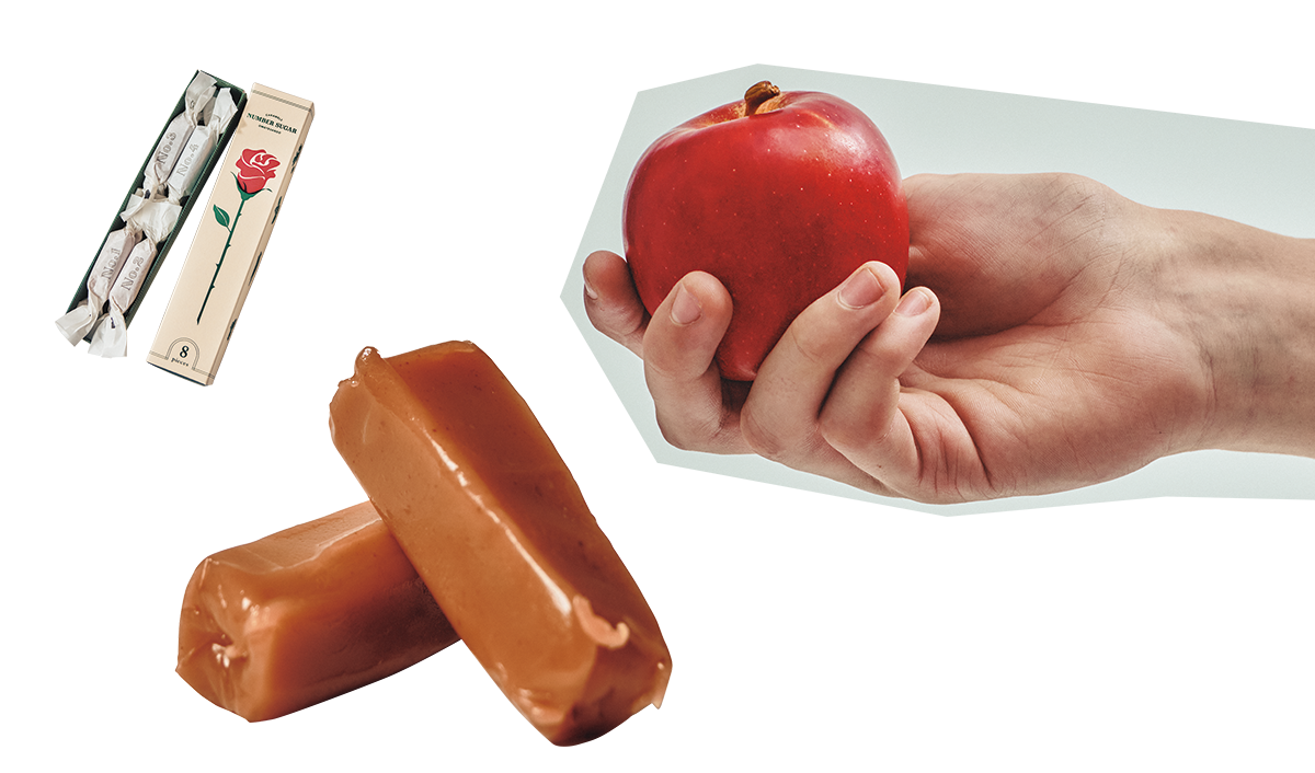 キャメルとレッドを探していたら、素敵なスイーツを見つけたよ。そう、キャラメルとリンゴだ。キャラメルは専門店の「ナンバーシュガー」で。厳選した素材を使って、香料や着色料など余計なものは一切なし。じっくりと一粒ずつ手仕事で作っているから驚くほど口溶けはなめらかで、自然な甘味は上品で優しい。薔薇が描かれた8ピース入りのボックスで持ち運ぼう。そしてリンゴは紅玉がいいと思う。酸味と爽やかな香りが特徴で、キャラメルももっと美味しくなる。食べる前にはハンカチで磨いてあげよう。