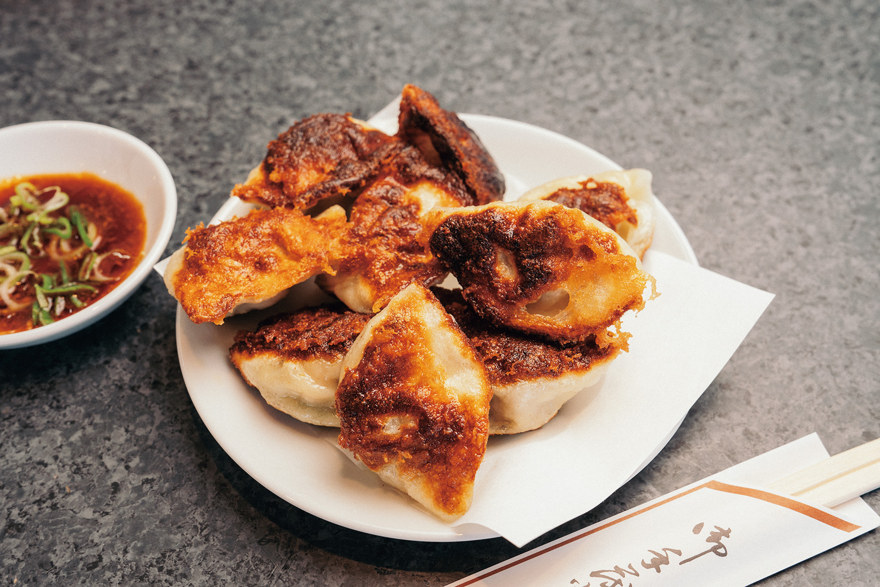 「焼き、揚げ、水と3種の餃子はどれもうますぎ! 目の前で餃子が包まれ続ける様子が見られる厨房の周りはアリーナ席です。丸テーブルで相席になることもあるので、それさえも楽しめる間柄のふたりにおすすめ」(平野)。一晩寝かせたモチモチの皮で包むのは、プリッと歯応えのある豚肩ロースの餡。にんにくが入っていないので、デートでの利用には嬉しい。
