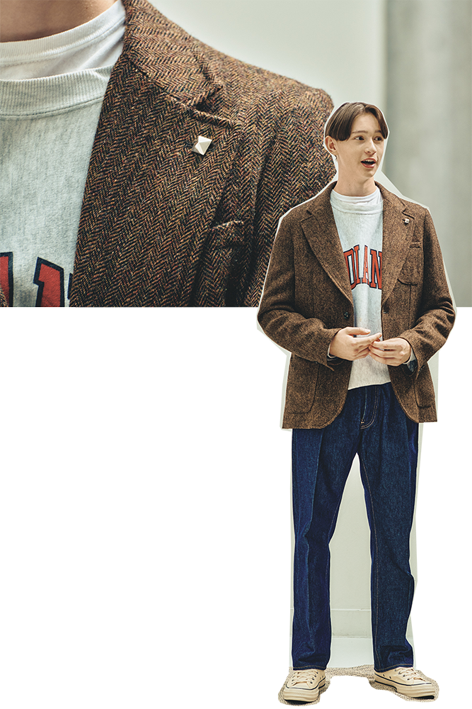 ヘリンボーンジャケット¥209,000(ノア/ノア クラブハウス☎03·5413·5030) ユーズドの〈チャンピオン〉のスウェット¥15,400(サンタモニカ 原宿店☎03·5474·1870) スタッズバッジ(3個セット)¥77,000(バニー/スプリームス インコーポレーテッド☎03·3583·3151) スニーカー¥13,200(コンバース/コンバースインフォメーションセンター☎0120·819·217) その他は私物