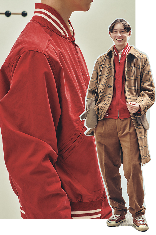 レッドとキャメル。前回の記事「いつもとちょっと違う色と柄で。」でもホリデーシーズンのフェイバリットカラーとして紹介したが、実際に組み合わせてみたらこんな感じ。’50年代風のスタジャンで赤を差し入れ、キャメルのコートやパンツで包み込むようにしてみる。足元はスニーカーでも、上品でちょっと楽しげ。