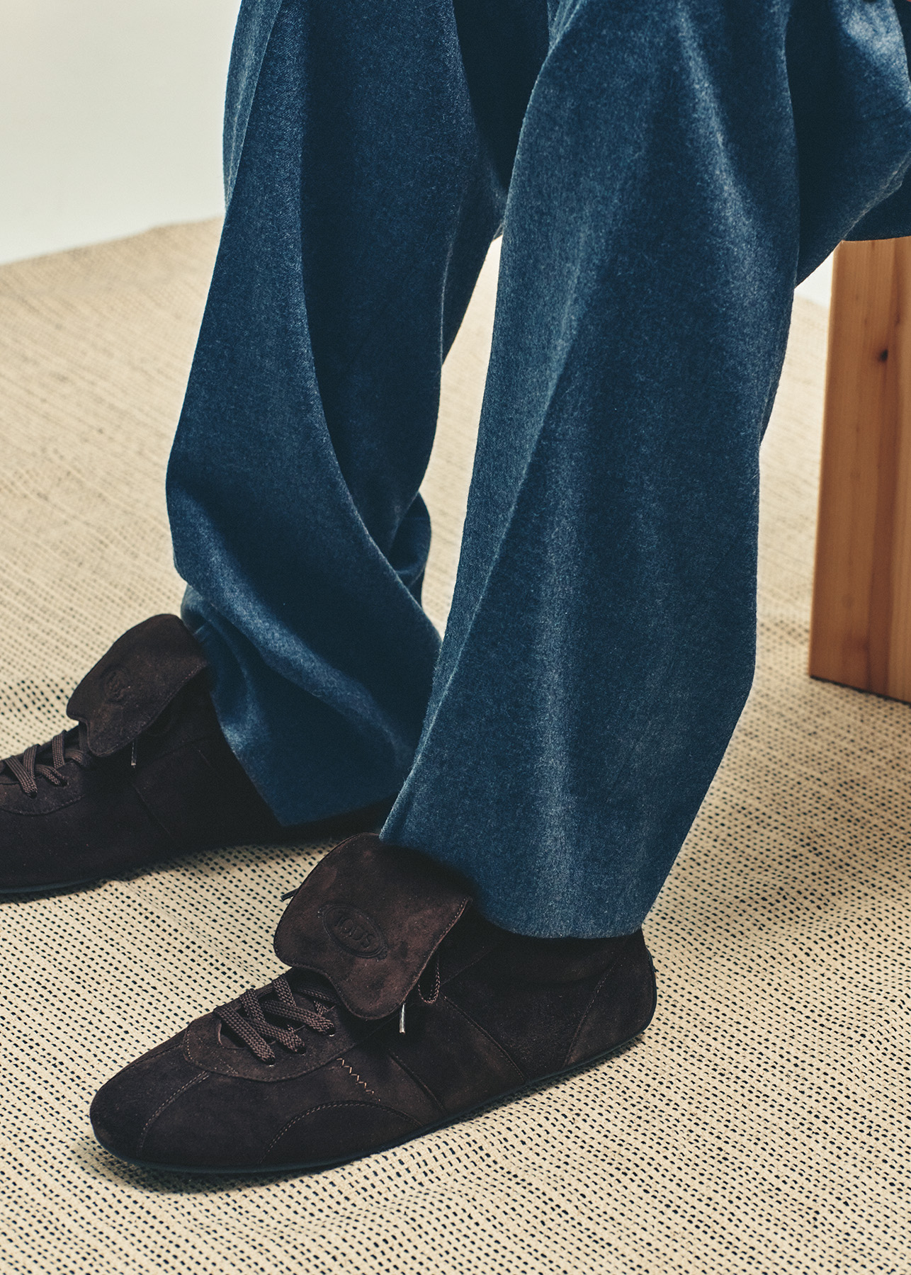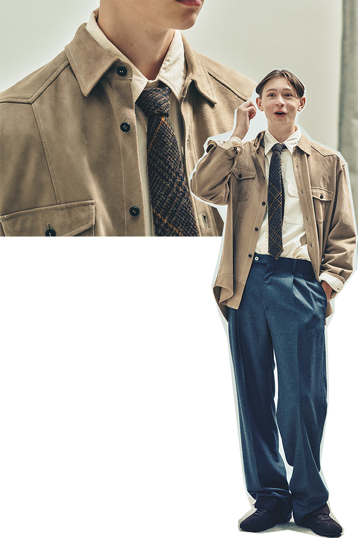 スエードのシャツジャケット¥154,000(カル @cale.fst) シャンブレーシャツ¥33,000、ネクタイ¥19,800(ともにアナトミカ/アナトミカ 東京☎070·3144·0378) ライトウールスラックス¥44,000(オーラリー☎03·6427·7141) スニーカー¥152,900(トッズ/トッズ・ジャパン☎0120·102·578)