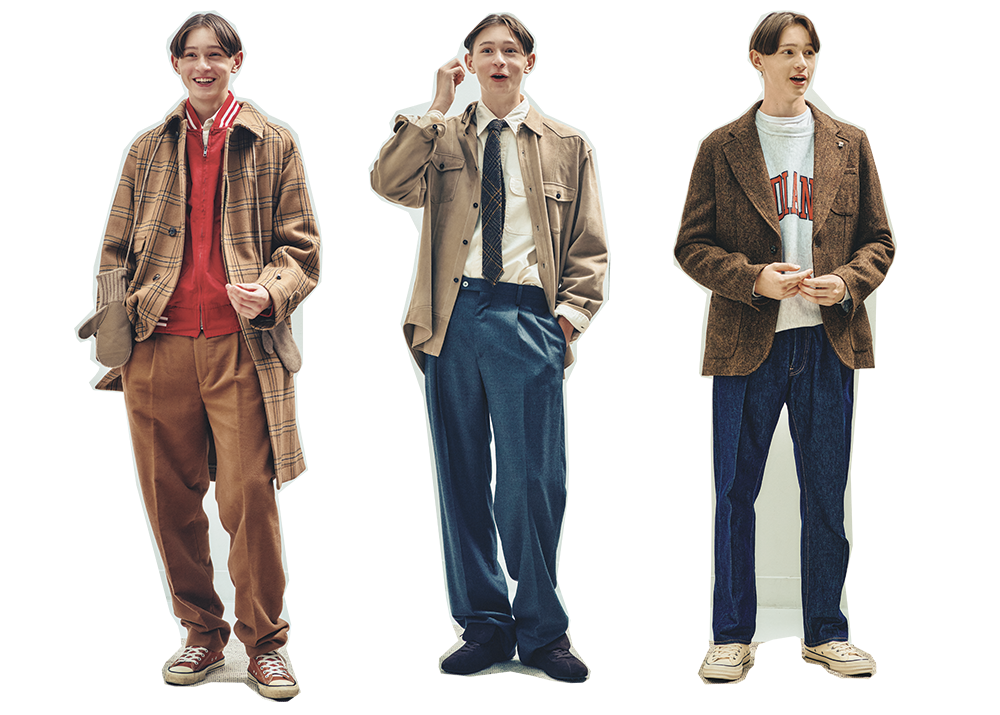 ウールメルトンのトラベラーコート¥143,000(キャプテン サンシャイン☎03·6712·6830) コットンのバーシティジャケット¥51,700(ノア/ノア クラブハウス) ウールフランネルのスラックス¥36,300(トゥモローランド☎0120·983·522) ベビーカシミヤミトン¥55,000(オーラリー) その他は私物