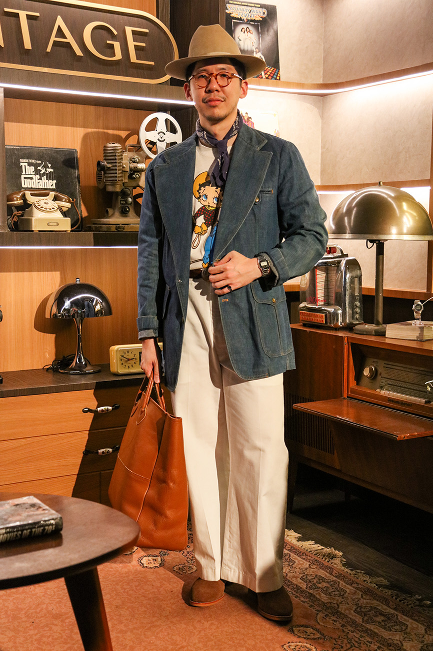 カメラ片手にうろうろしていた彼は、イベントの撮影に呼ばれたバンコクのカメラマン。普段は地元のファッションメディア「cheeze mag」を主戦場にしているみたい。だからか、板に付いたアメカジスタイルが誰よりも素敵。