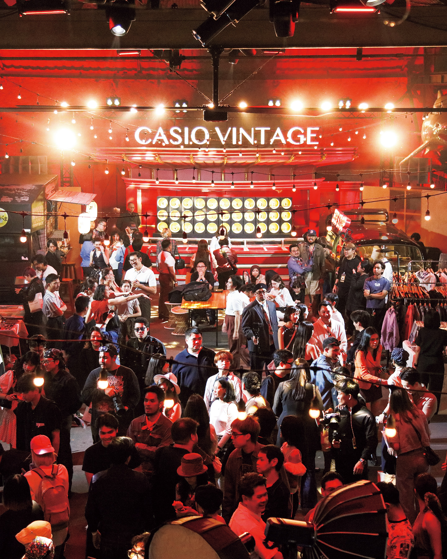 バンコクといえば、フリーマーケット。毎週末、いたるところで開催されると聞くが、11月の末にタラートノイと呼ばれるバンコク屈指のヒップなエリアで催されたのは、〈カシオ〉主導のフリーマーケットだ。ポパイの「僕のアジアひとり旅2025」のバンコク編でも取り上げた複合施設「ウェアハウス」を会場に、この界隈にある古着店やレコード店やセレクトショップ、飲食店などが出店。たこ焼きや餃子を片手にレコードやヴィンテージTを漁ったり。DJの音に体を揺らしながら、ブース奥にずらりと飾られた〈カシオ〉の伝説の名機たちを眺めたり。バンコクの“古き良き”を限りなく集めた夜市のような楽しき一夜だった。「タイでは日本人と同じように古いものを愛でる文化があって、レトロな〈カシオ〉もタイの若者に人気。今回はそんな時計と一緒にヴィンテージを楽しめるフリマになったかなと」と、主催者のワラクル・ヤンソムバットさんと福島耀さんもだいぶ満足げな様子。その腕にはもちろんカシオウォッチ! タイ経由で古着の次は〈カシオ〉のレトロウォッチが来る!? 今から腕にしてよっと。