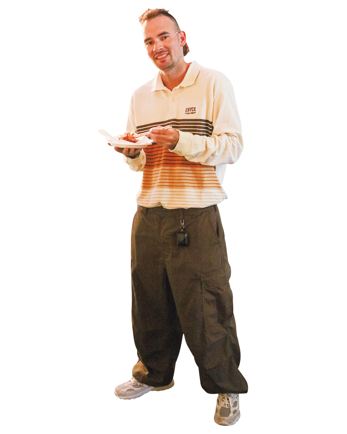 たこ焼きが似合う彼は、地元のクラブ『BLAQ LYTE』を根城にするDJ。’00年代のBボーイの制服だったブランド〈エニーチェ〉を選ぶあたりもセンス良し。