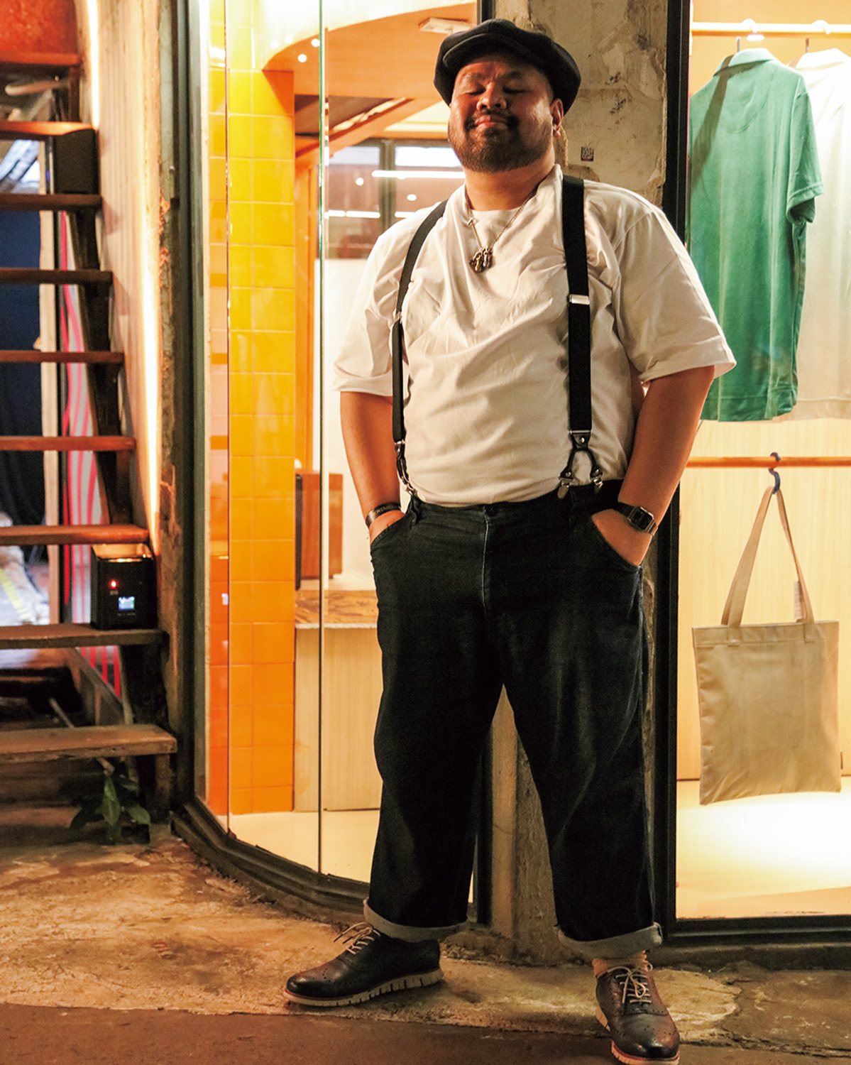 白Tにブレイシーズにデニム。そして、頭にはキャスケット! どこの国のスキンズかと思いきや、なんと「カシオ ジャカルタ」の社員。〈ピーナッツカンパニー〉のネックレスもなかなかツウだね。