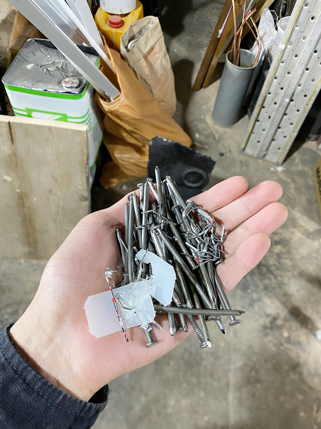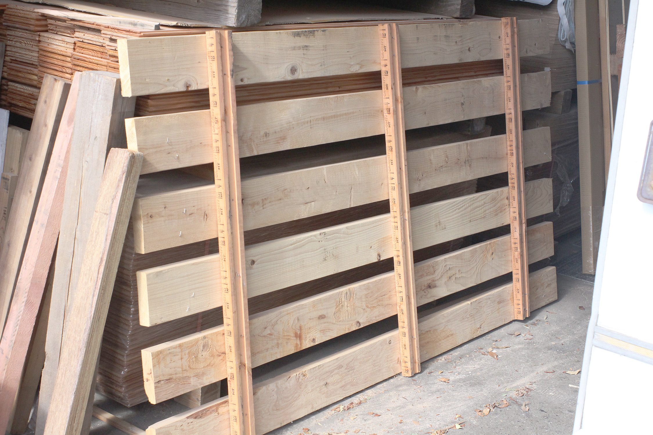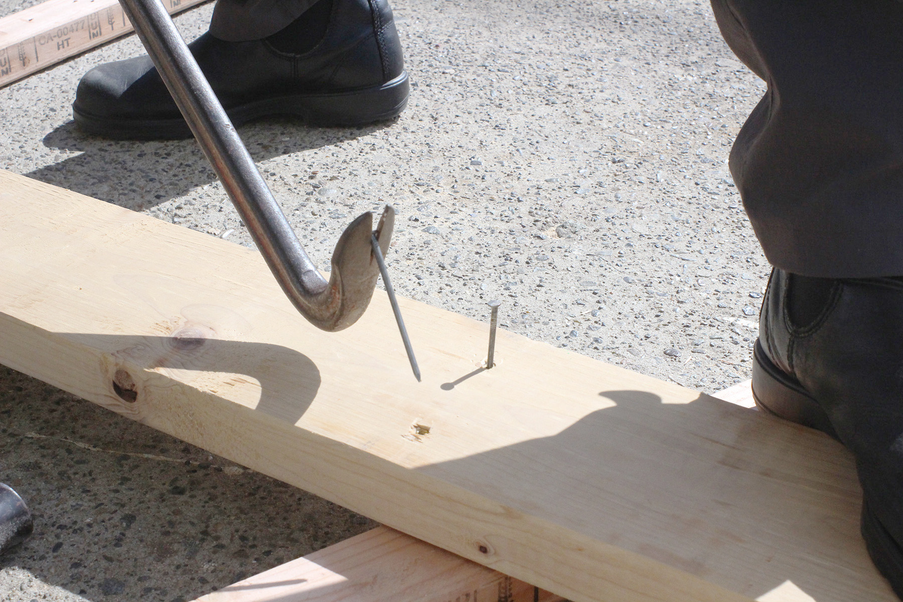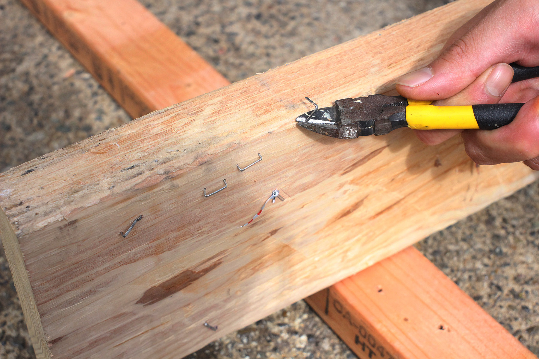 まずはなるべく木の反りがなく、虫に食われていたり、松ヤニが出ていないパレットを選ぶ。一枚一枚、組み立てに使われる釘をバールで抜いていく。錆びたり変形しているものもあるので、なかなかいい汗をかく根気のいる作業だ。さらに小さく細かいタッカーの芯はペンチで除去する。丹念にチェックし、異物を取り除いたらOK。