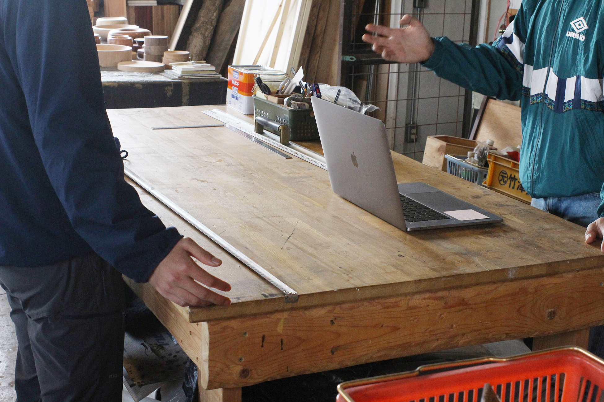 まずは打ち合わせからスタート。リクエストしたのは「日頃PC作業をしたり、印刷用紙を広げたりする編集者やデザイナー、ライターが最大10人は座れるくらいのサイズで」「足が広々と伸ばせるように」と、素人目でもわかるほどデカいサイズ。搬出・搬入も考えて、幅1250mm/高さ700mmの長方形タイプを2つ作ることが決定! 流れとしては、ざっと以下のとおり。
