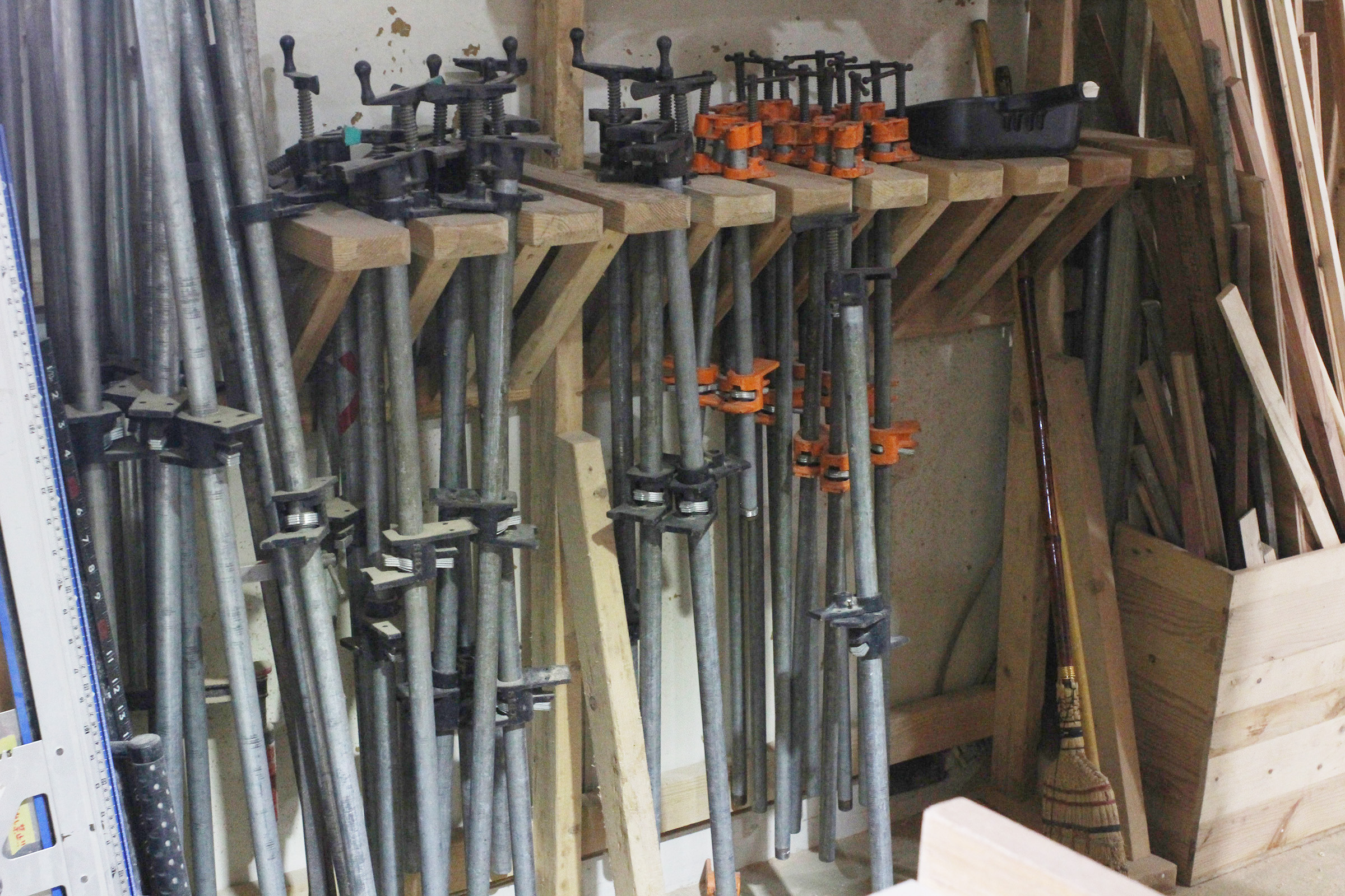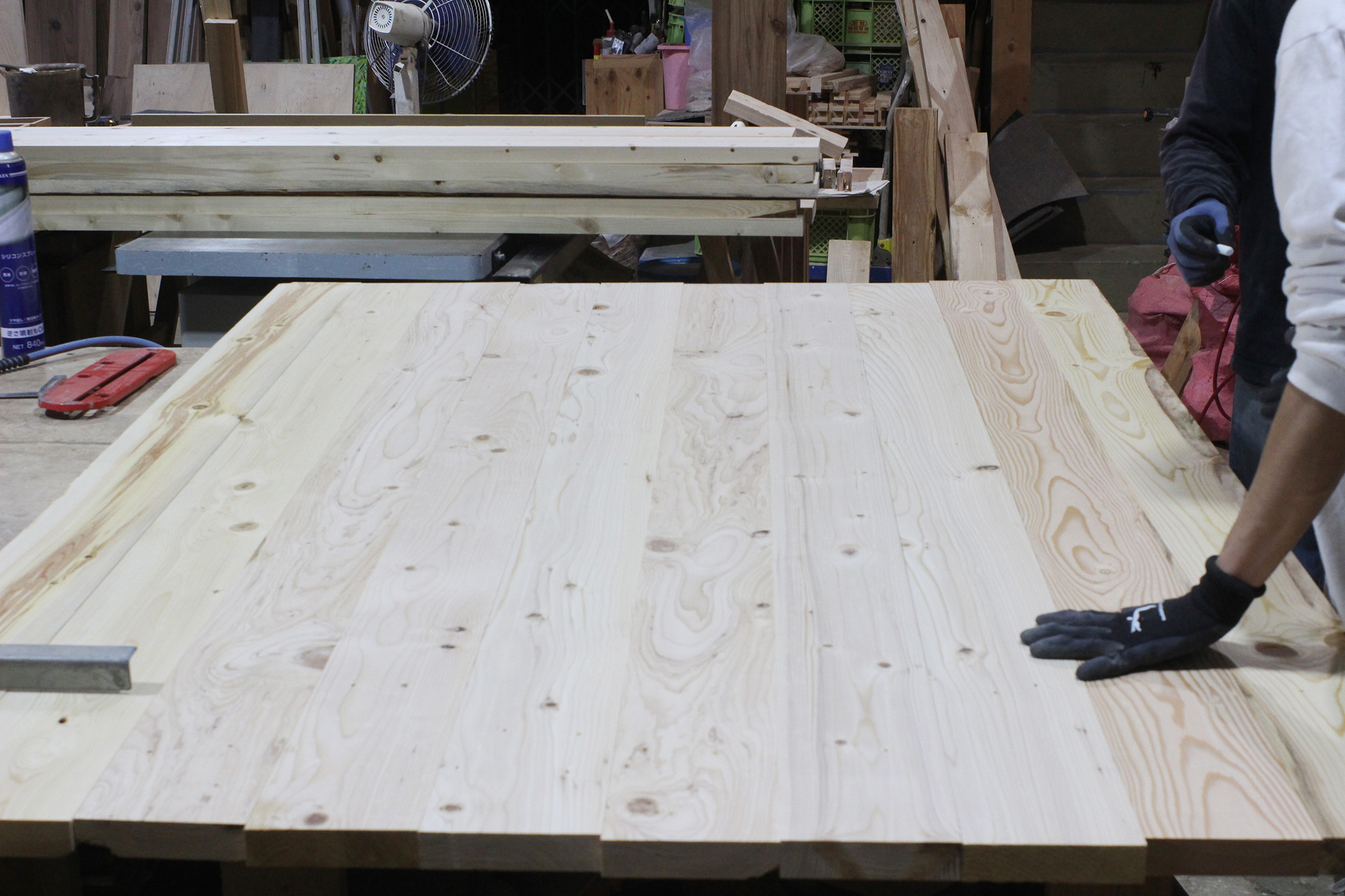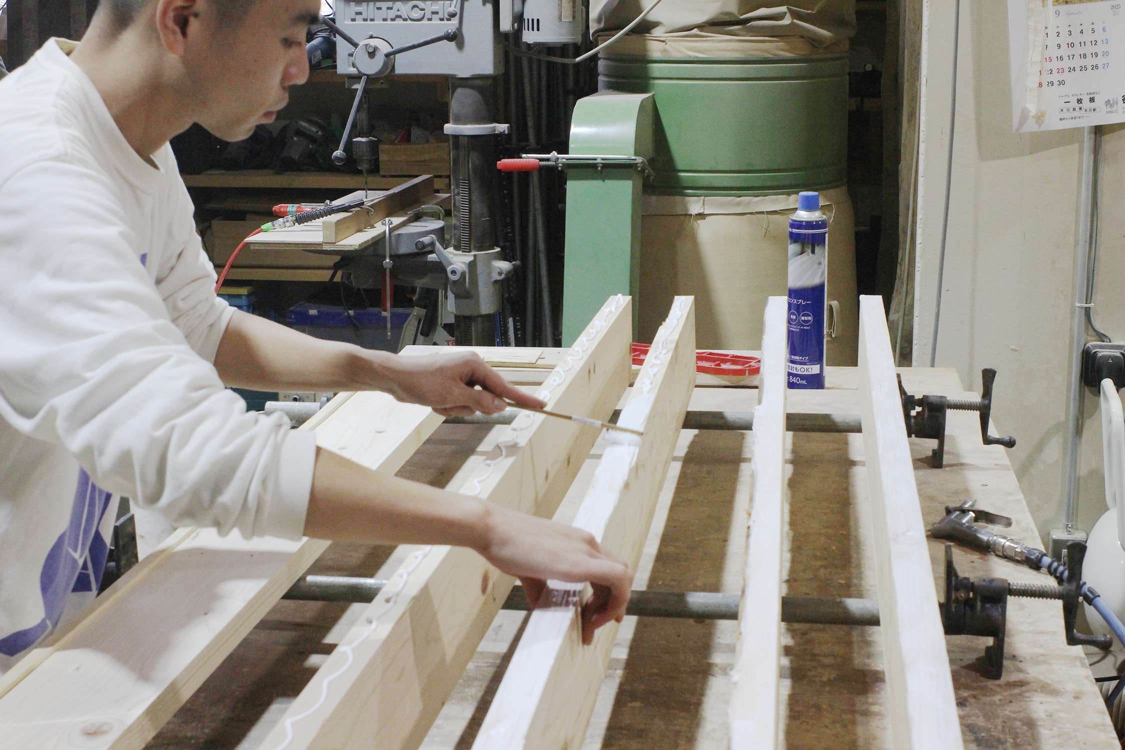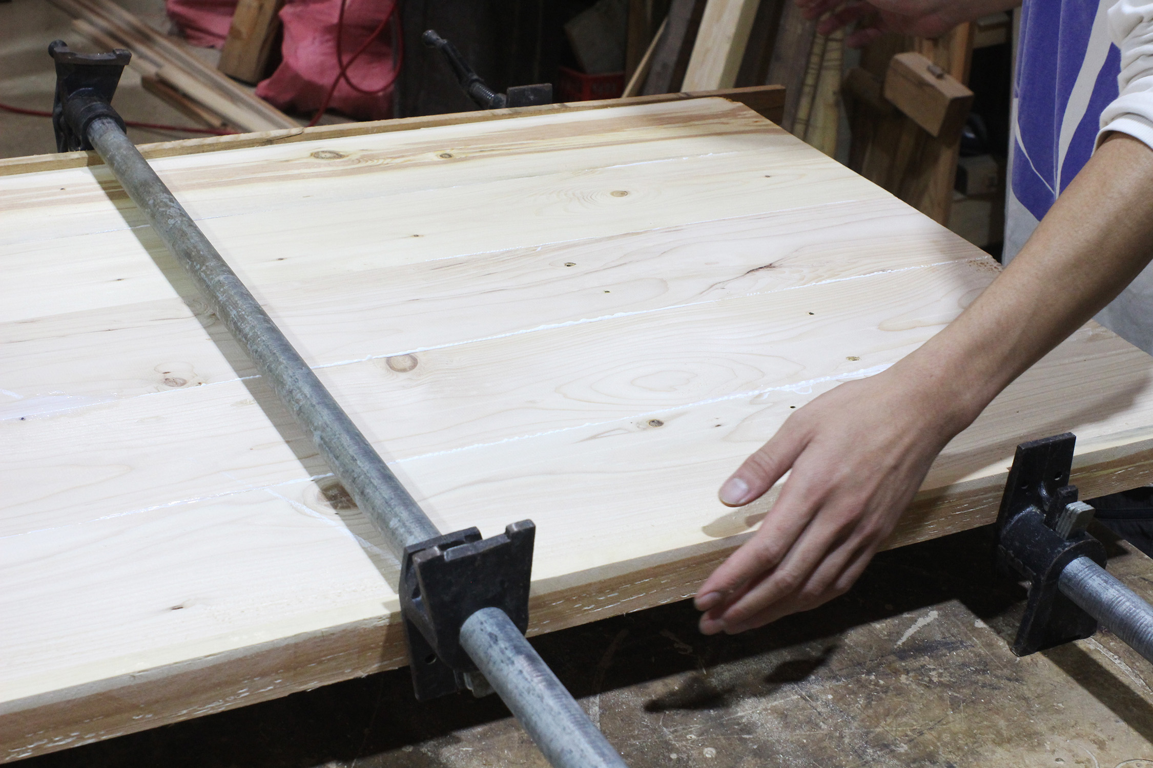 幅と厚みが揃ったら、天板の木材を張り合わせる順番を決めていく。今回は一枚あたりのパレット材は10枚。木目に合わせた方が綺麗だけど、それぞれ個性があるので色合いや質感を見ながらパッチワーク感覚で組み合わせていく楽しい作業だ。ここで使うのは「ハタガネ」と呼ばれる、表裏から挟んで圧着固定するための締め具。跡がつかないように当て木を忘れず、木の側面に木工ボンドを刷毛で塗り込み、力強く締め上げていく。