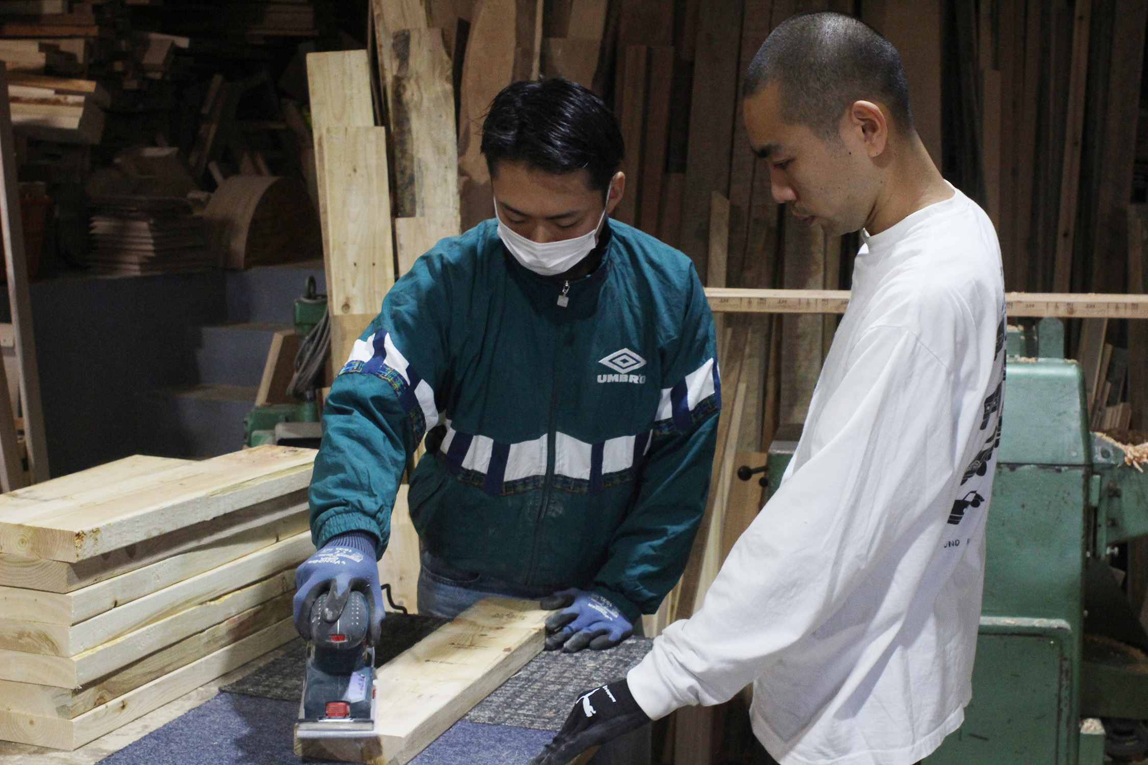 はじめに特筆すべきは、材木。曰く「物流の現場で使用される廃棄予定の『木製パレット』を再利用して作る」とのこと。荷物を載せて運んだり、保管したりするために重宝するスノコ状のアレ。聞けば、環境にも優しいゆえに、かねてより家具や内装業の材料としてアップサイクルしてきたそうで、工房には引き取ってきたそれらが山盛りに保管されているのだ。考えてみれば、日本でいち早く西洋文化がもたらされ、今も膨大な貨物を扱う玄関港である横浜らしい材。俄然テンションが上がる。