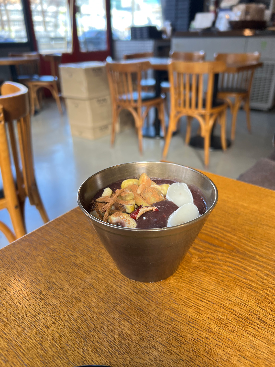 真鍮の器はほの温かく、中にはトロリと柔らかく炊かれた小豆あん。そこに、ゆで栗、なつめ、松の実、桔梗の根(喉に良いらしく、甘露煮にしてお菓子に使われるそうです)、ニッキ、そしてふたきれの餅がのっています。