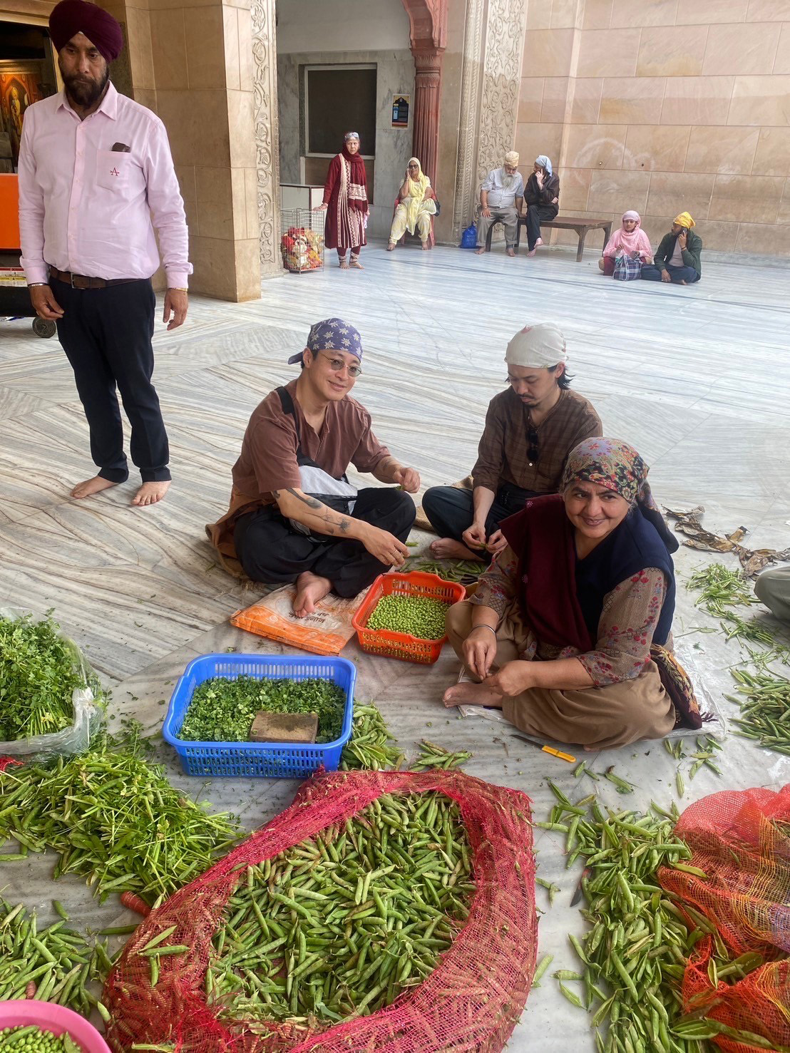 そこはオールドデリーにある、シーク教徒の寺院「グルドワラ」。参拝すると、カレーやチャイなどの施しを受けることができます。寺院のあちこちで信者たちが豆を剥き、野菜を切り、チャパティを伸ばしているので、私たちもその輪に加わって手伝いました。