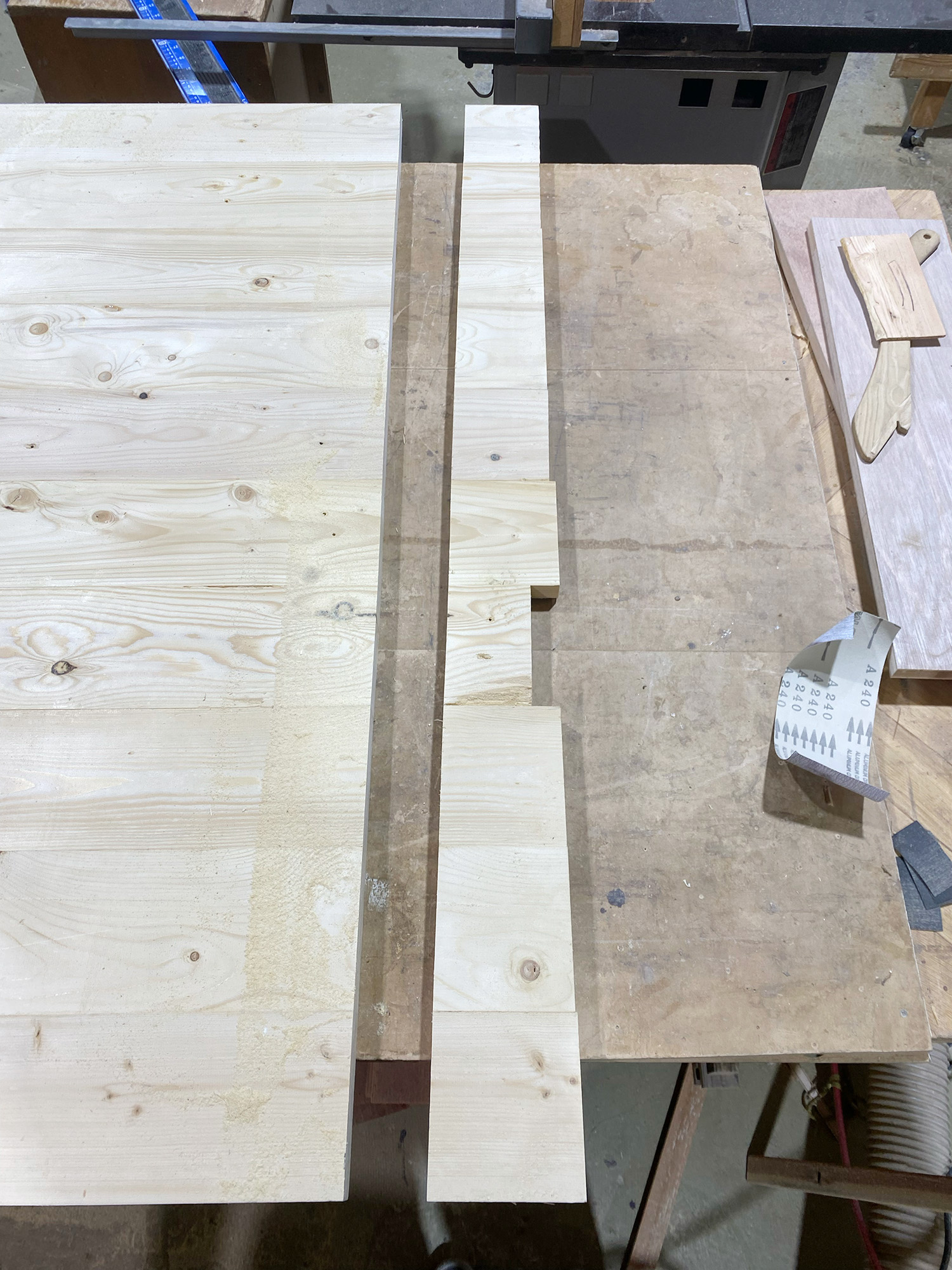 日が暮れ出した頃、いよいよ天板のサンディングへ。サンドペーパーという紙の研磨材を駆使して表面の微細な起伏を滑らかにしたり、どうしても加工機械でついてしまう刃物の傷を消す作業だ。とにかく根気、根気、根気! 握力がなくなるまで磨き上げる。終わったと思ってもまだアラが目立ってくるのは原稿を執筆するときと似ているかもしれない。
