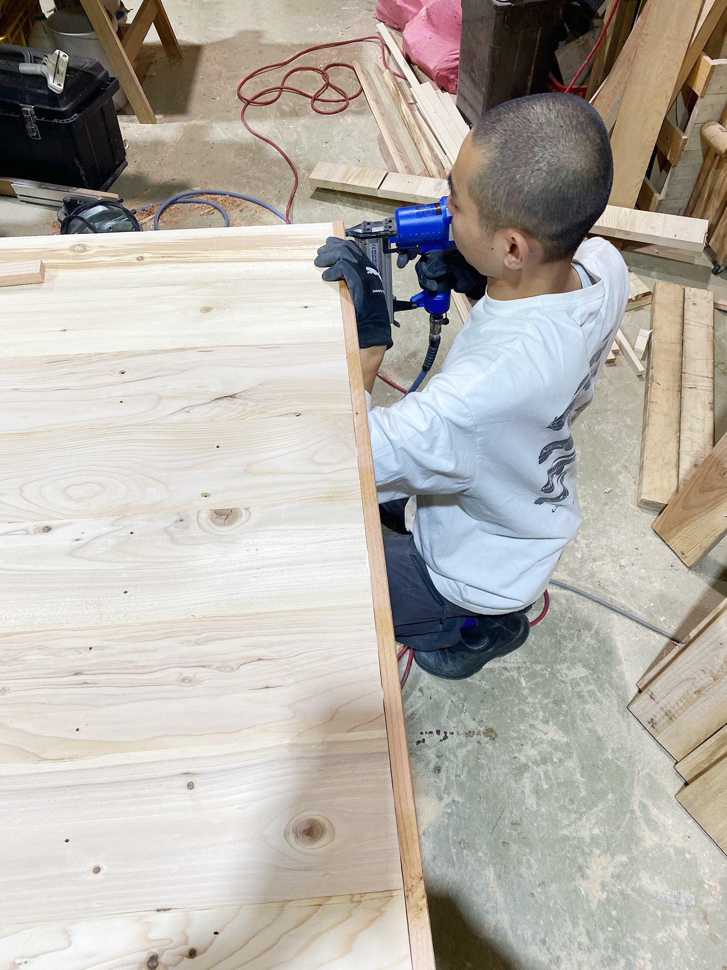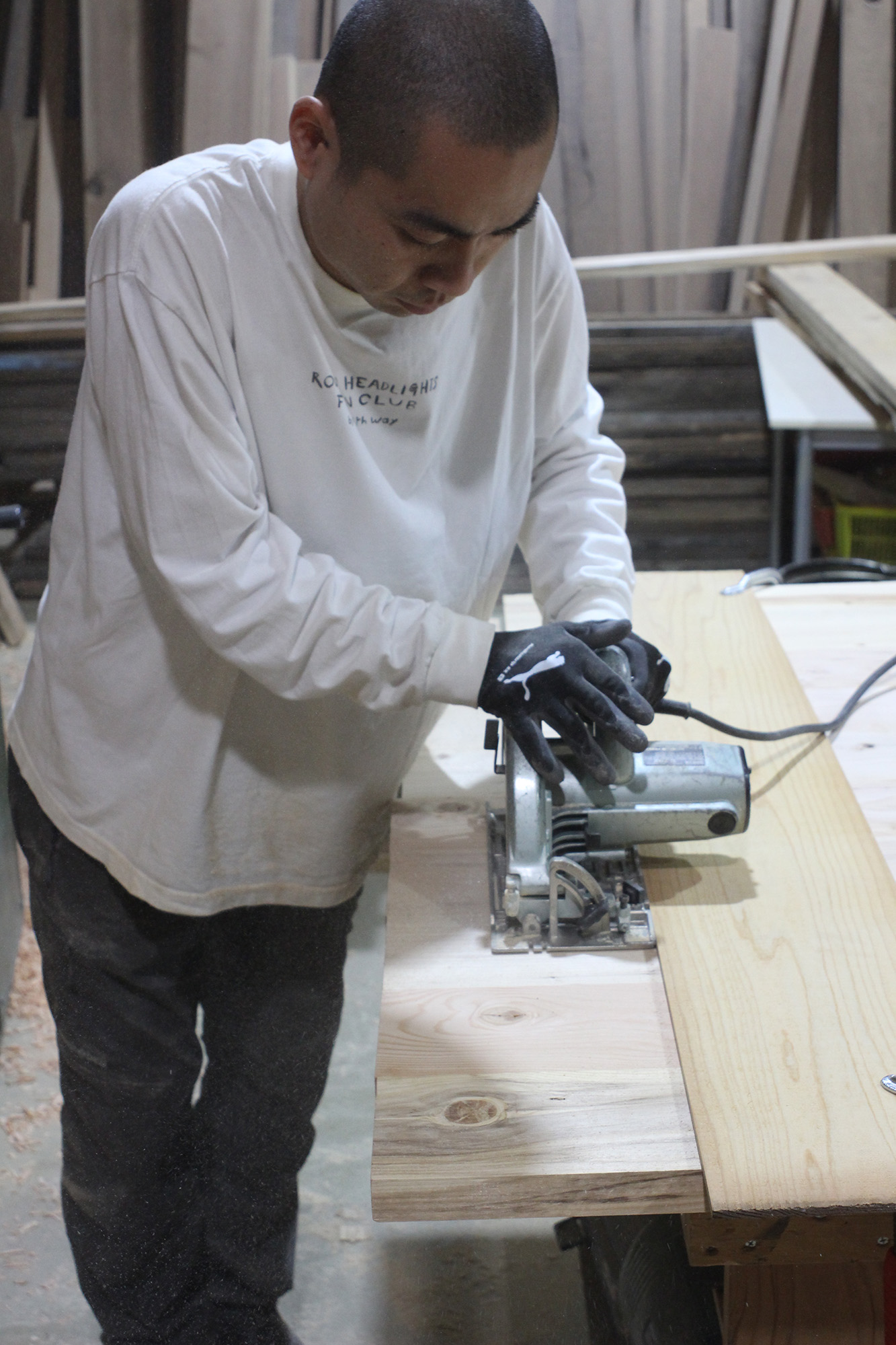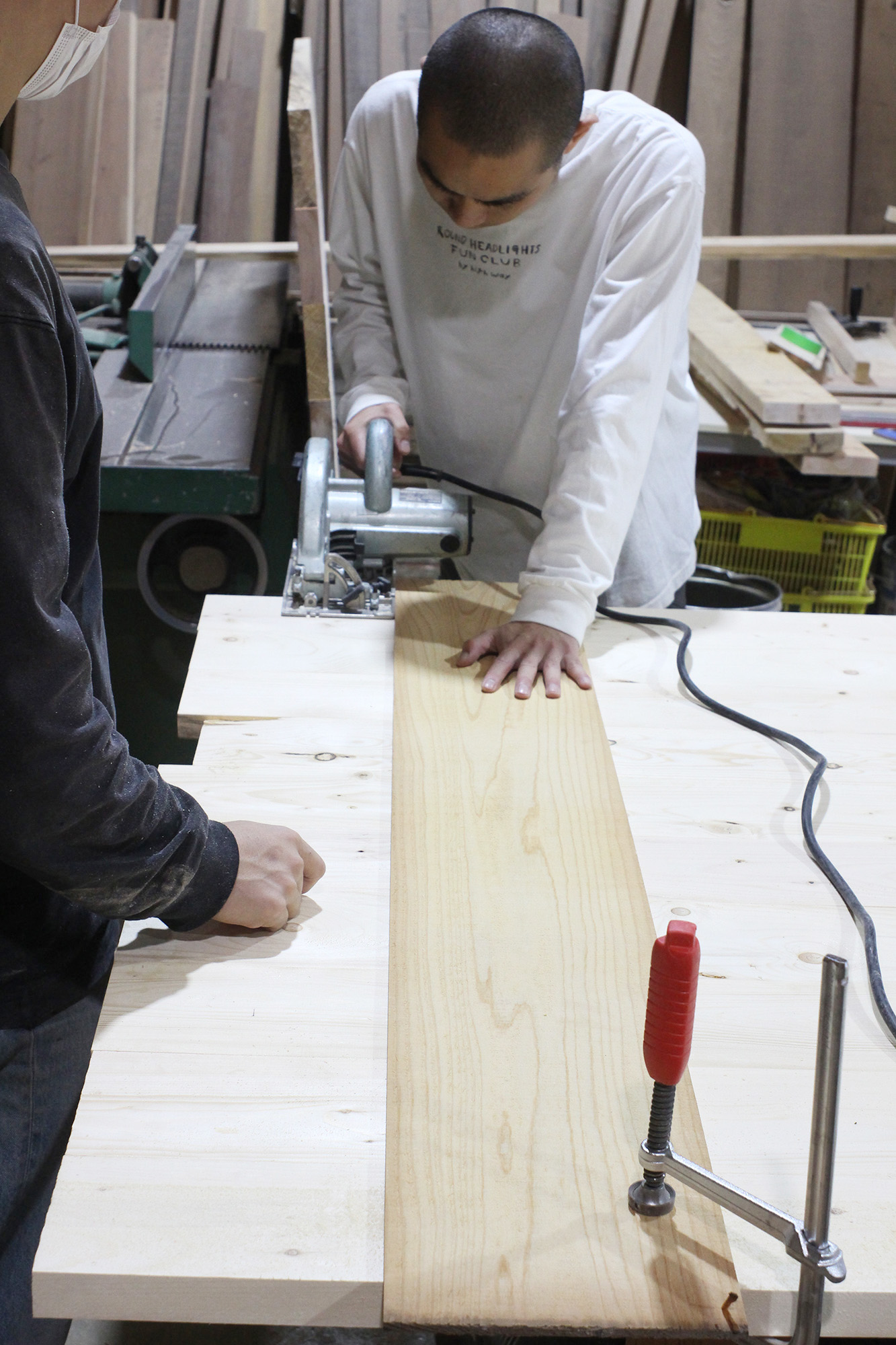 天板からハタガネを外し、左右を希望の長さに揃えていく。工具は木工作業のなかでも危険度トップクラスの「丸ノコ」。思わず緊張感が背筋を張らせ、肩が強張る。というのも、高速回転する刃が材料に挟まったり、木の節などで急激な負荷がかかったりすると、自分のカラダ側へ本体が飛んでくる恐ろしい現象「キックバック」が起きるのだ(実際、全国各地で毎年のように死亡者も出ている)。安藤さんに見守られながら、慎重に切り進めて……無事にクリア! 日頃から使いこなす職人のかっこよさを身をもって体感した。