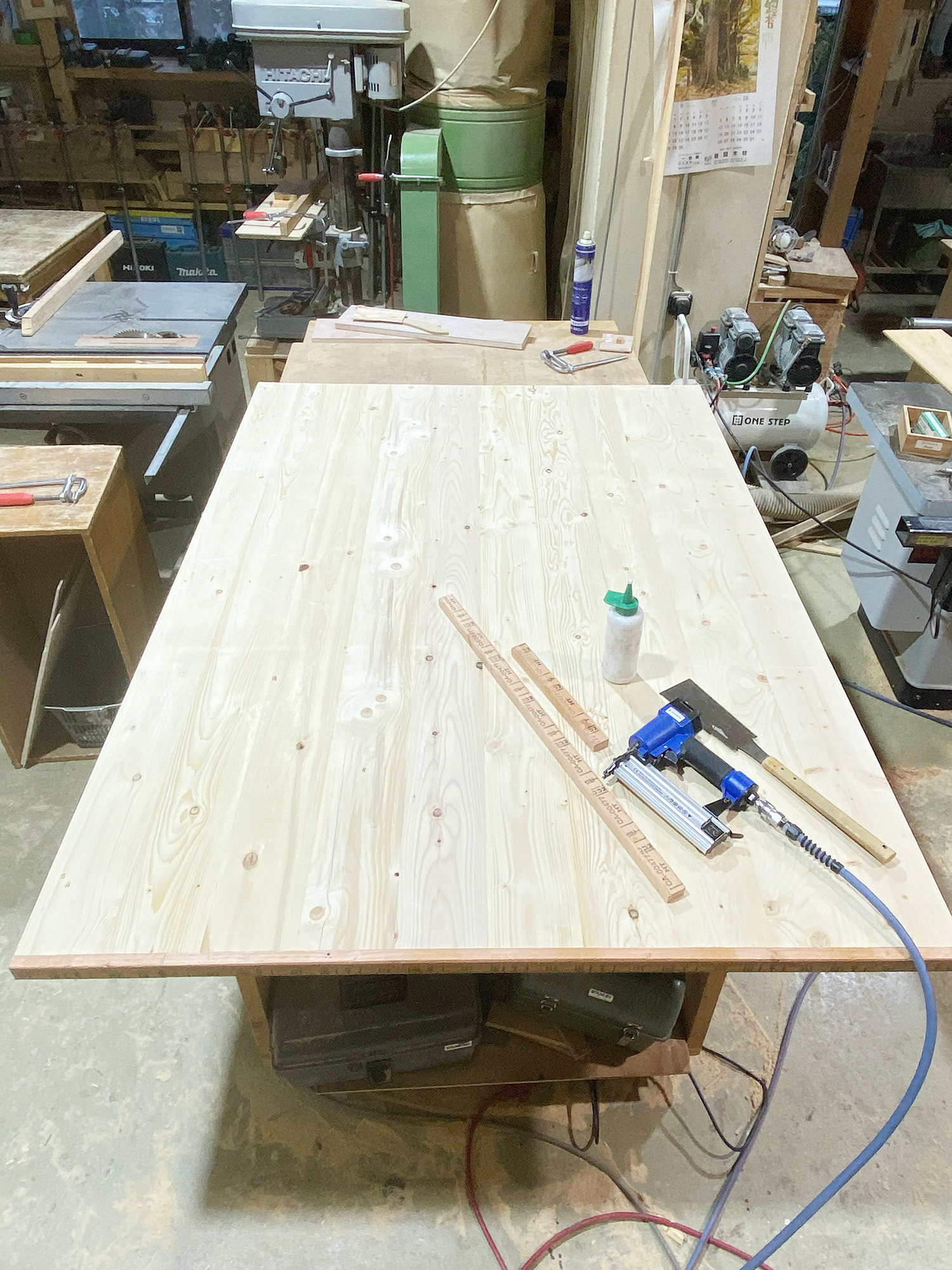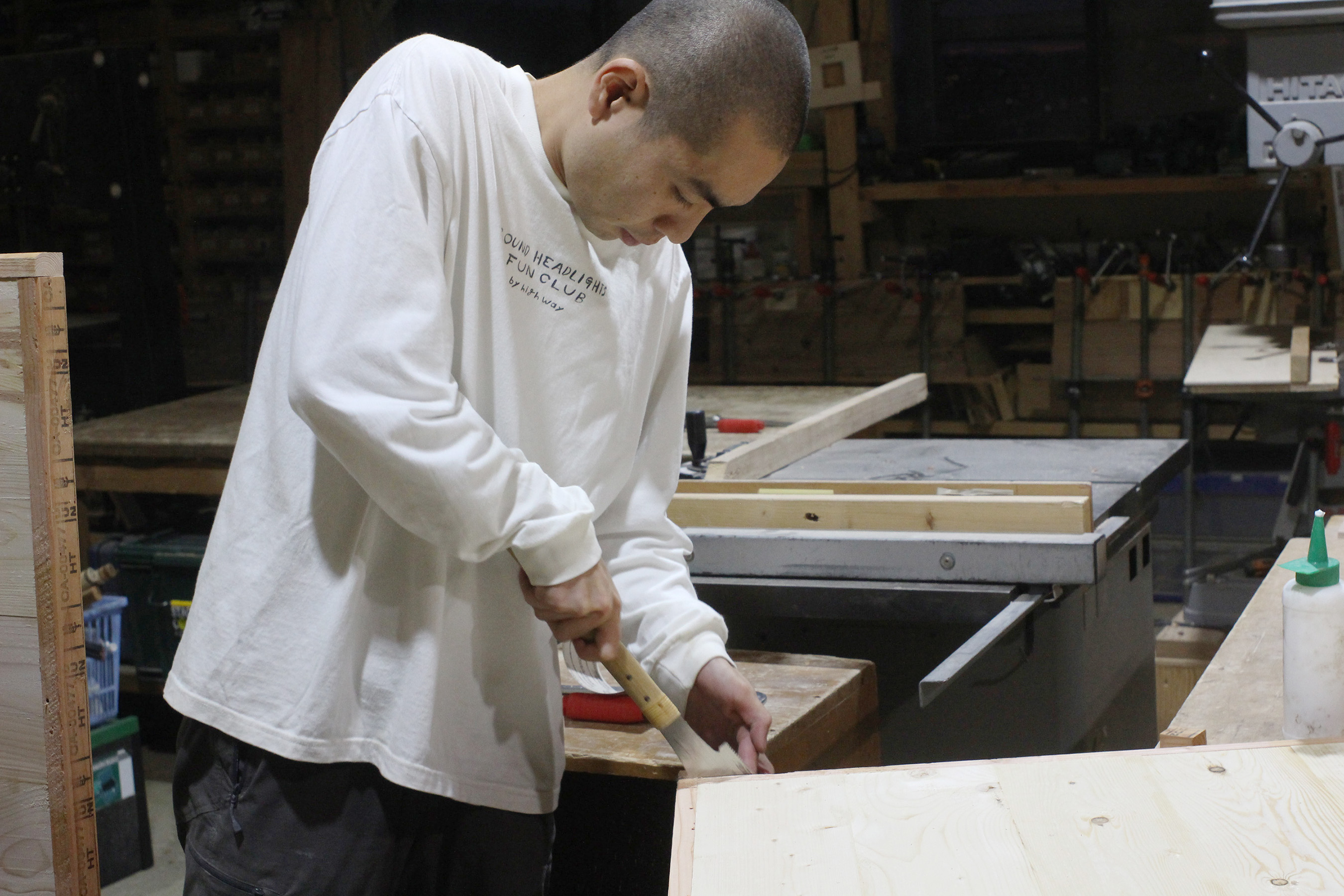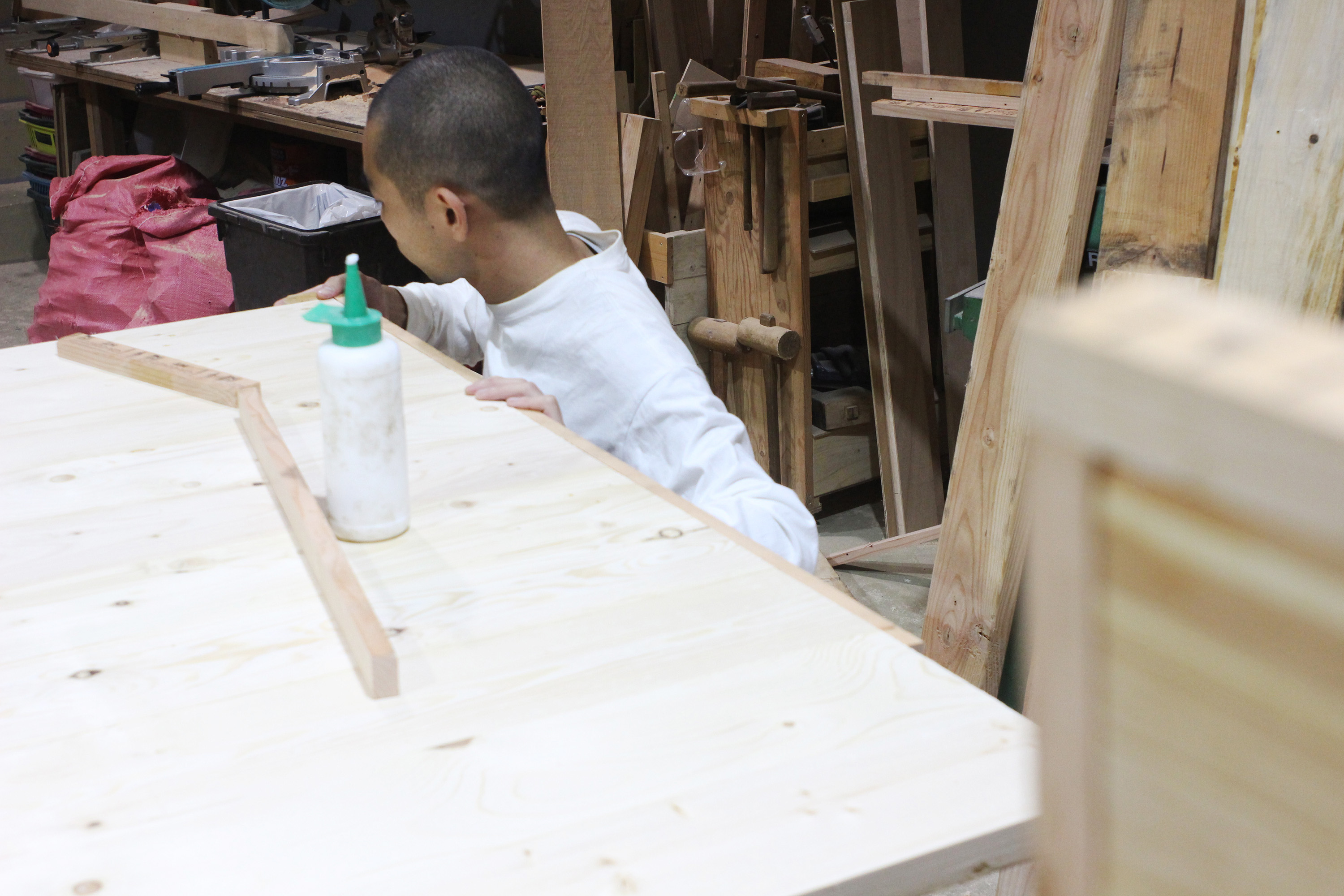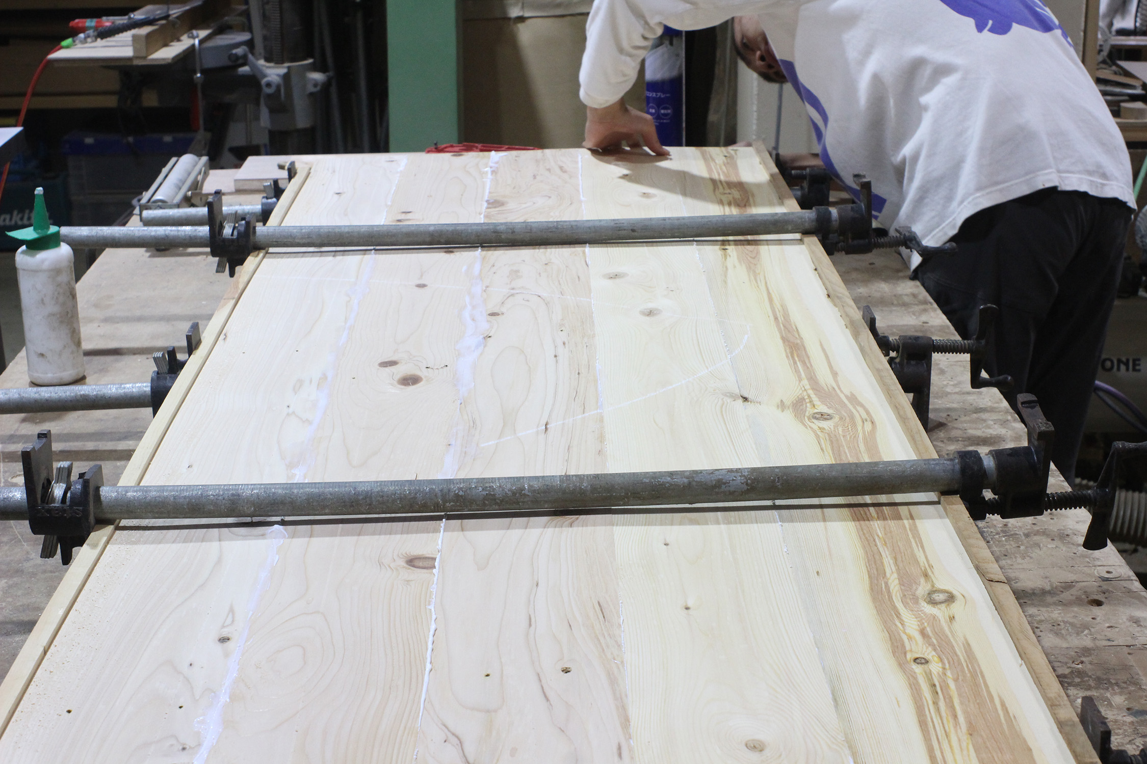 横浜を拠点に店舗内装業や家具製作を主に行う工務店『ティープラスター』にご協力いただき、POPEYE Web編集部のデスクを制作! 2日目は、一晩かけてガッチリ貼り合わせた天板を仕上げていく。