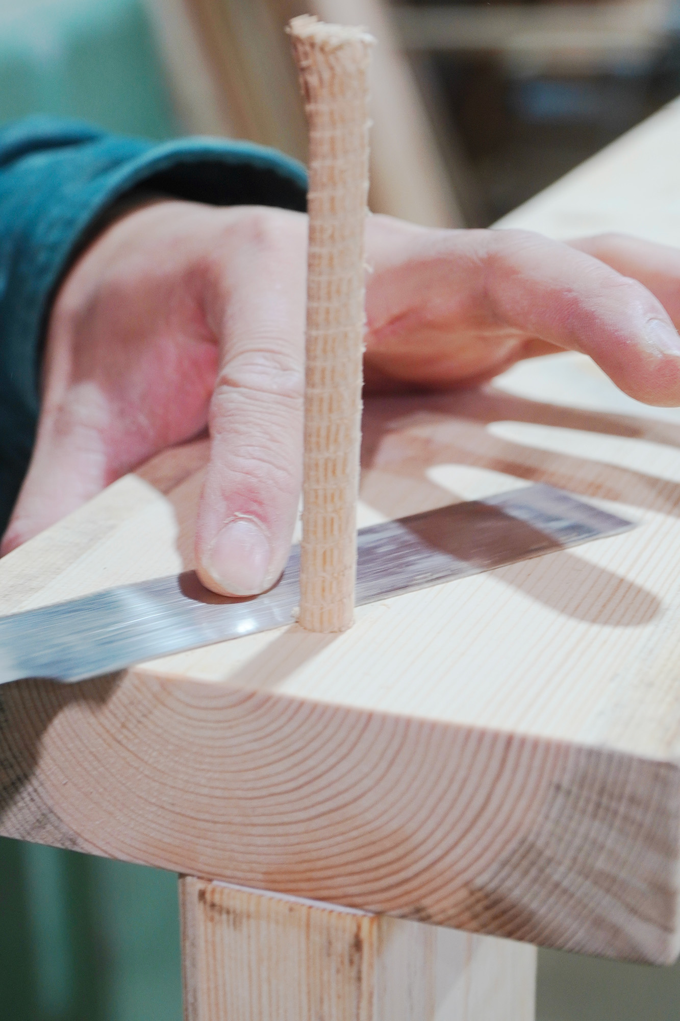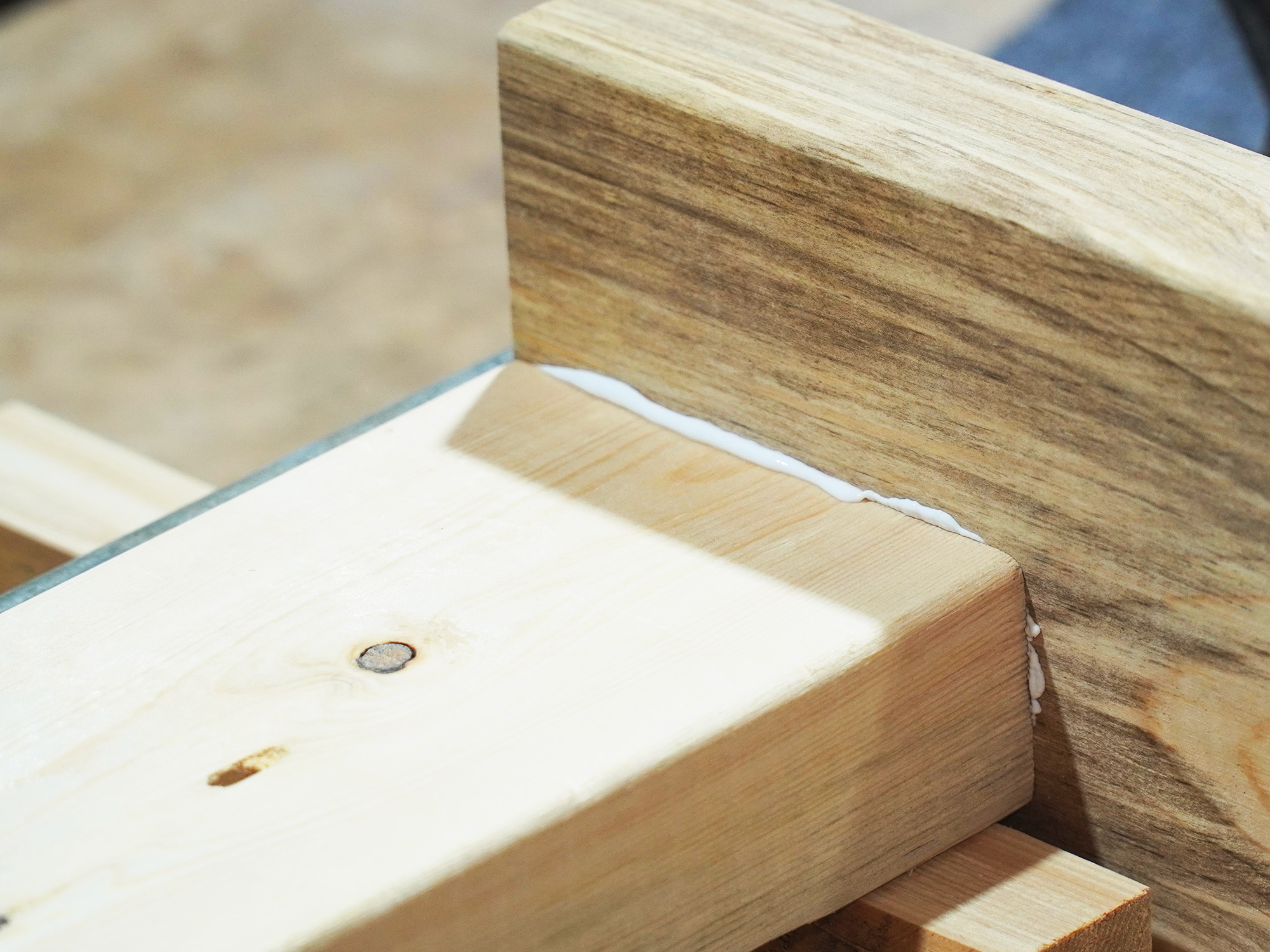 ②で製材を終えた脚の材木を並べ、まずは前日同様サンディングを。そして、今回は床との接地面が広く、安定感、耐荷重、強度が優れている「ロの字型」に組み上げていく。まずは内側の板同士をボンドで補強し、下穴を開けて少し深くネジを打ち込む。次にネジの頭は円筒形の棒・ダボで隠し、余った部分はダボ切り鋸で切り落とす。