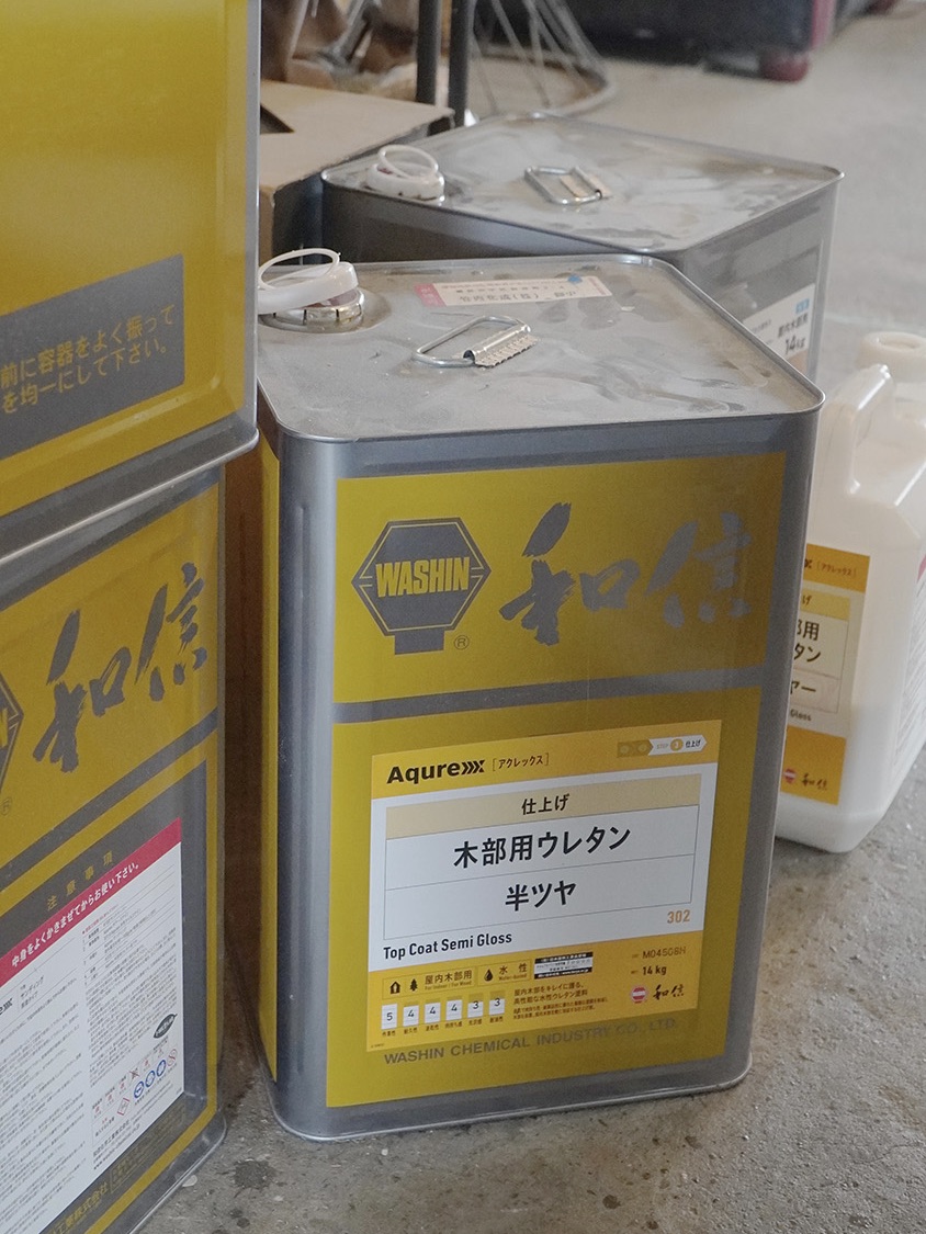 いよいよ最後の仕上げ・塗装。木工では溶剤が大きく「オイル」か「ウレタン」に分かれる。前者は木に浸透させ本来の風合いを残すが定期的なメンテナンスが必要で、後者は表面を塗膜で覆うことで傷や水に強くなるが手触りが損なわれるという、一長一短の特徴を持つ。最後の最後で後悔したくなくて非常に悩ましいけど、聞けば、どうやら「ウレタンを薄めたもの」がオススメ。これならガシガシ使いつつ、木の温もりも出せるとのこと!