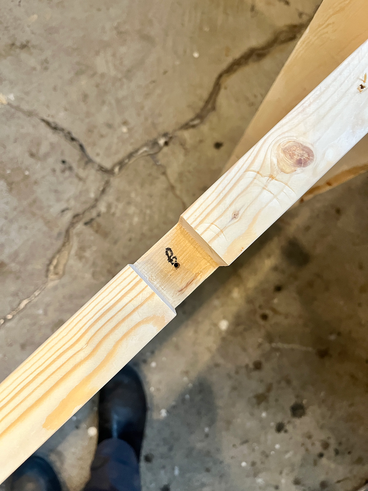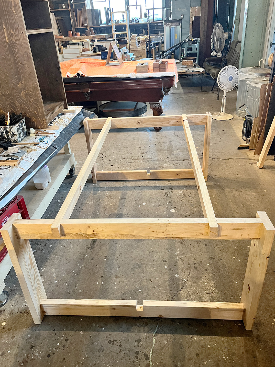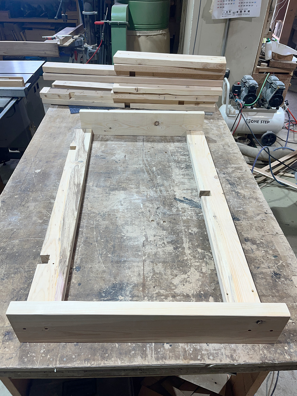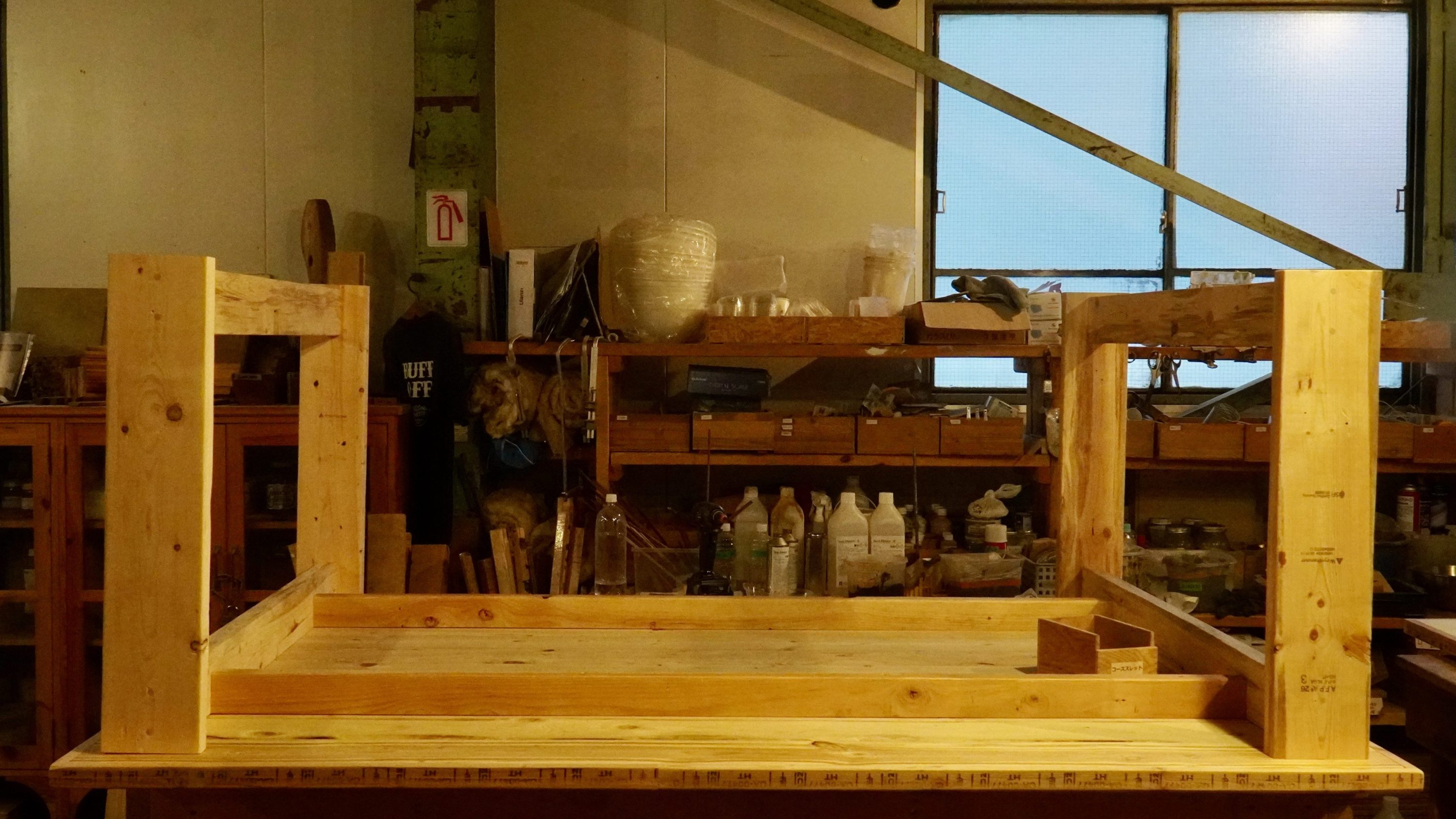 組み上がった脚部分はこんな感じ。横揺れを防ぐために、左右それぞれのロの字を繋ぐ「貫」も用意した。