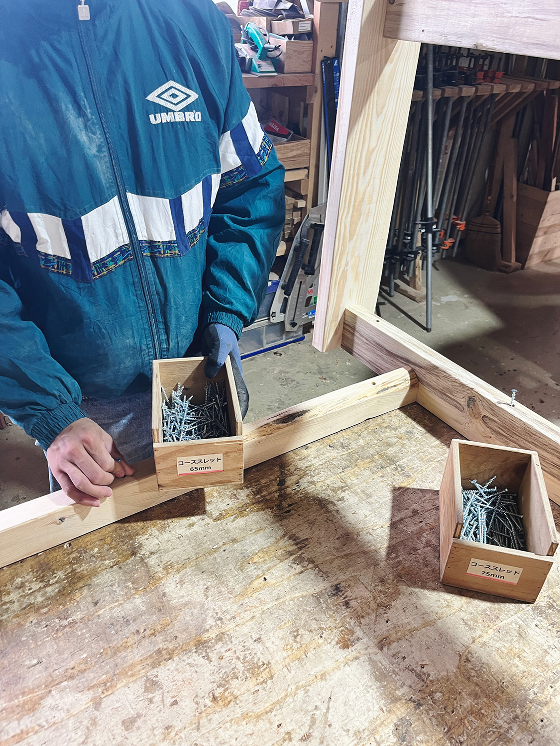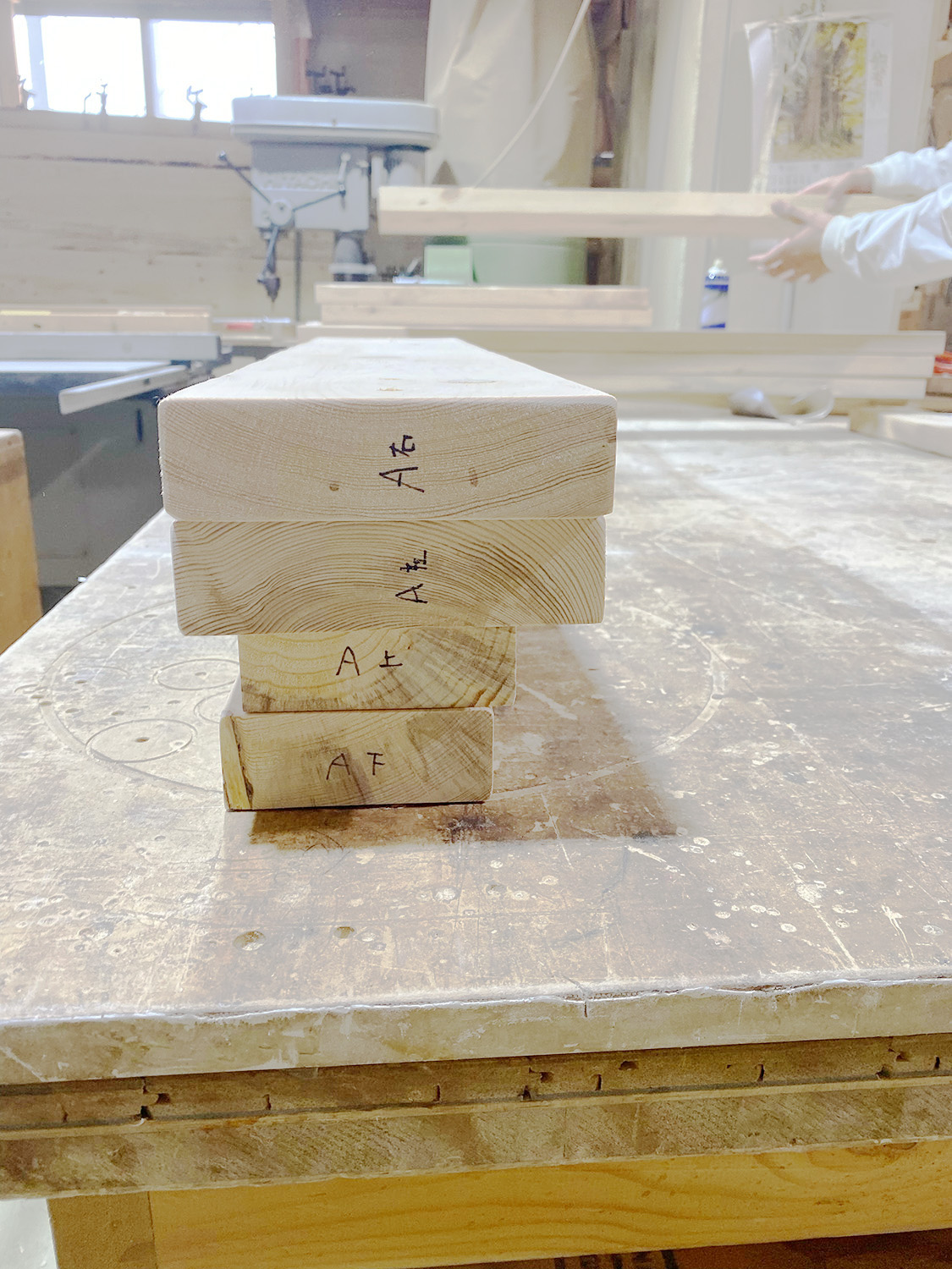 最後は天板と脚を合わせて、ネジを打ち込む位置を決めて下穴を開ける。このとき、組み合わせた両者が対になるように「印をつけておくこと」が超重要。ほんの1mm以下かもしれないけど、開けた穴の位置や角度が異なっていた場合、いざ搬入現場で組む際に上手く組み立てられないこともあり得るからだ。なんせ編集部にはドライバーしかないから、臨機応変に対応できないわけで。安藤さんと入念に確認しながら行った。